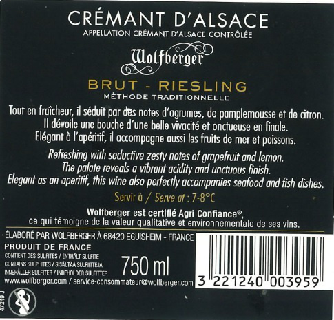 | Libellé | Crémant d'Alsace AOP Wolfberger Riesling - Brut - 75 cl |