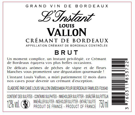 Libellé Crémant de Bordeaux AOP Louis Vallon L'Instant - 75 cl