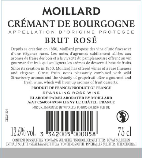 | Libellé | Crémant de Bourgogne AOP Moillard - Brut Rosé, 2023 - 75 cl |