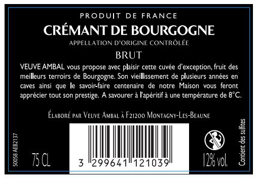 Libellé Crémant de Bourgogne AOP Veuve Ambal - Brut - 75 cl