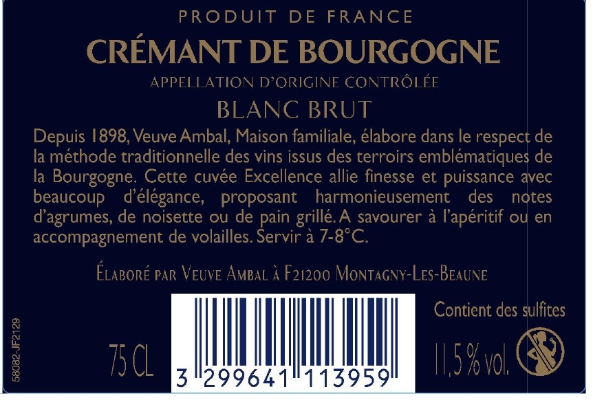 | Libellé | Crémant de Bourgogne AOP Veuve Ambal Excellence - Brut - 75 cl |