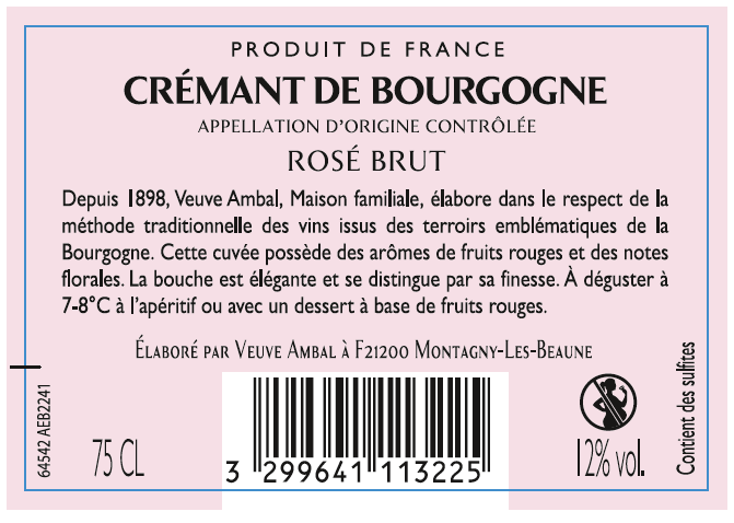 Libellé Crémant de Bourgogne AOP Veuve Ambal Grande Réserve - Brut Rosé - 75 cl