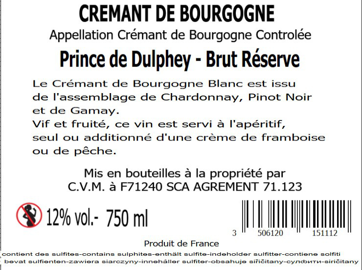 | Libellé | Crémant de Bourgogne AOP Vignerons de Mancey "Prince de Dulphey" - Brut - 75 cl |
