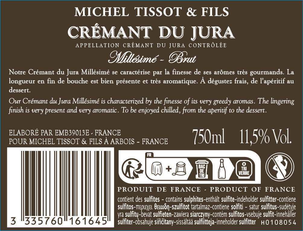 | Libellé | Crémant du Jura AOP Michel Tissot - Brut, 2018 - 75 cl |