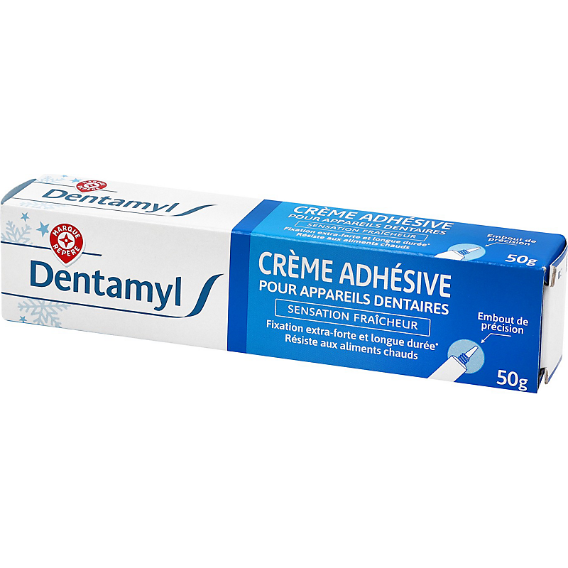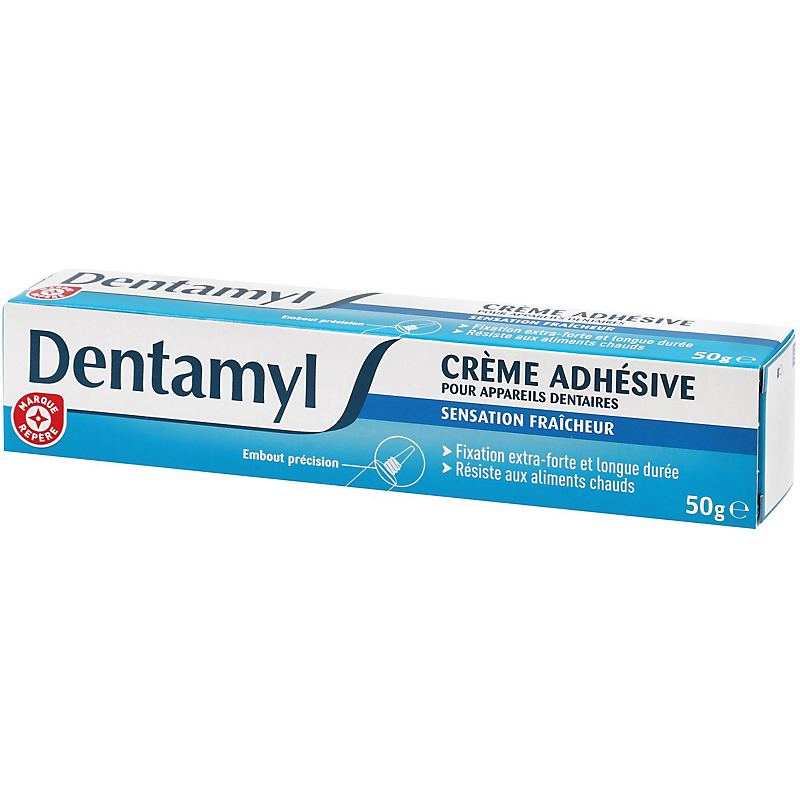 la crème adhésive Dentamyl doit être changée après chaque repas ; je l'utilise seulement pour la nuit