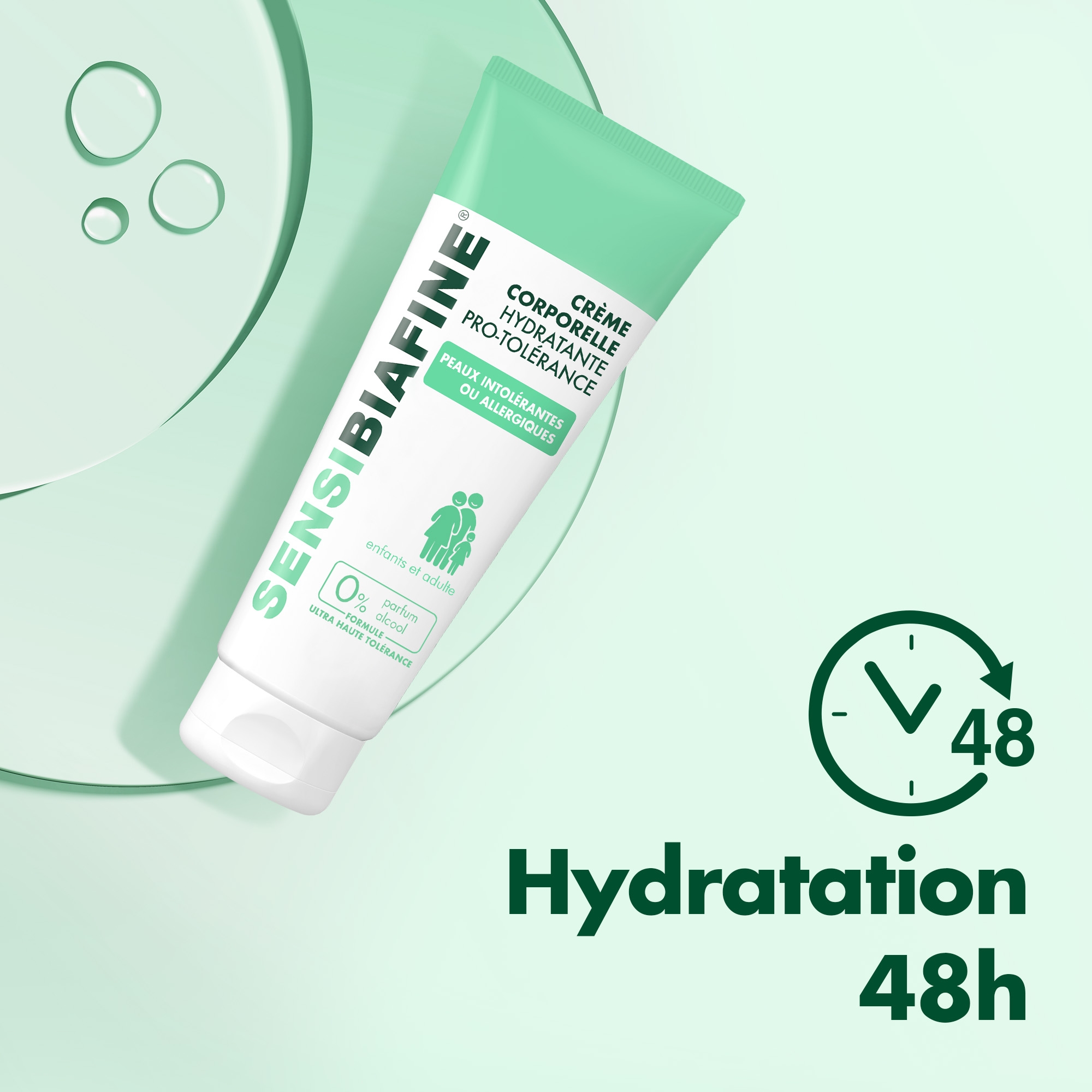 La crème Corporelle Hydratante Pro-Tolérance SENSIBIAFINE®, avec sa formule minimaliste ultra haute tolérance, 0% parfum et alcool (sans éthanol), développée sous contrôle médical et testée cliniquement par un allergologues, hydrate les peaux intolérantes ou allergiques de toute la famille, dès 3 ans. Enrichie en actifs hydratants et protecteurs, cette crème corporelle : • Soulage immédiatement les sensations d'inconfort et aide à réduire les signes de réactivité cutanée (rougeurs, picotements) • Hydrate intensément la peau durant 48H • Renforce la fonction barrière de la peau et limite les risques d’allergies Dès le premier jour, la peau est soulagée et durablement hydratée. Jour après jour, elle est plus résistante aux agressions extérieures. Sa texture crémeuse, non grasse et non collante, spécifiquement développée pour les peaux intolérantes ou allergiques, convient à l’ensemble du corps.