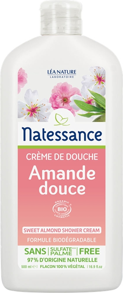 Natessance crème de douche amande douce 500 ml avec base lavante douce issue de la noix de coco, formulée sans sulfates, sans savon, sans palme, et d'origine 100% végétale, nettoie la peau en douceur et efficacement, tout en la respectant. le délicieux parfum d'amande de cette crème de douche vous offre une véritable expérience sensorielle. cette crème de douche à la texture onctueuse et au ph physiologique vous apportera une parenthèse de bien-être et une sensation d'évasion.
