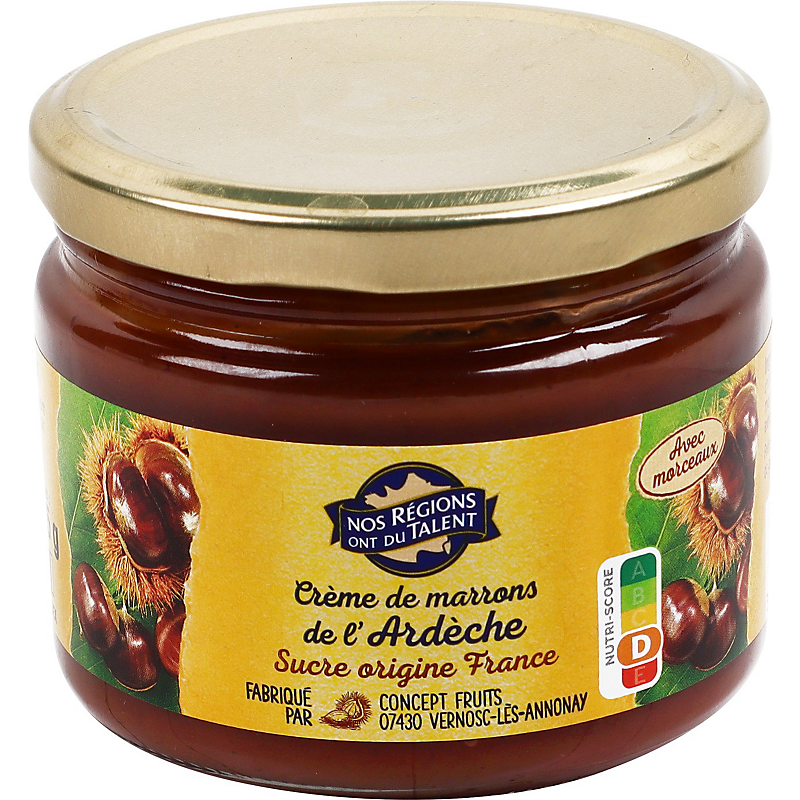 Ingrédients : Sucre 47,4 %, purée de châtaignes d'Ardèche AOP 38 %, eau, morceaux de châtaignes d'Ardèche AOP 7 %, extrait de vanille.