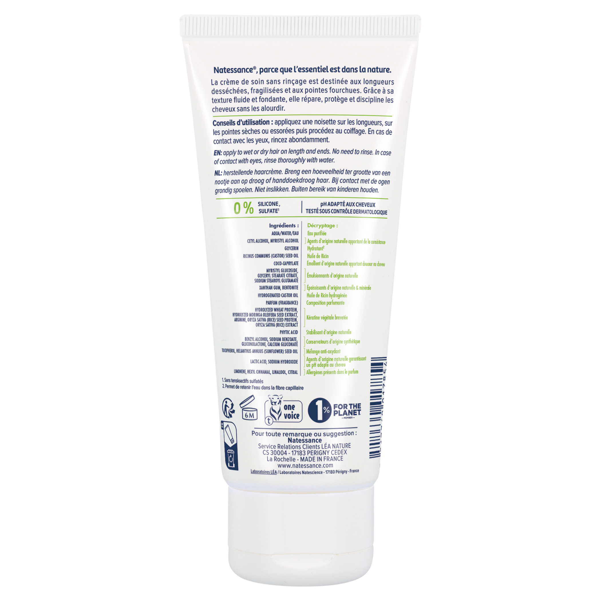 Natessance Crème de Soin Capillaire Sans Rinçage 100 ml est une crème réparatrice et protectrice à base d'huile de Ricin et de Kératine végétale brevetée. Celle-ci répare la fibre capillaire, facilite le démêlage et apporte la brillance. Cette crème est ainsi destinée aux longueurs desséchées, fragilisées et aux pointes fourchues. Grâce à sa texture fluide et abondante, elle discipline également les cheveux sans les alourdir. Testée sous contrôle dermatologique.