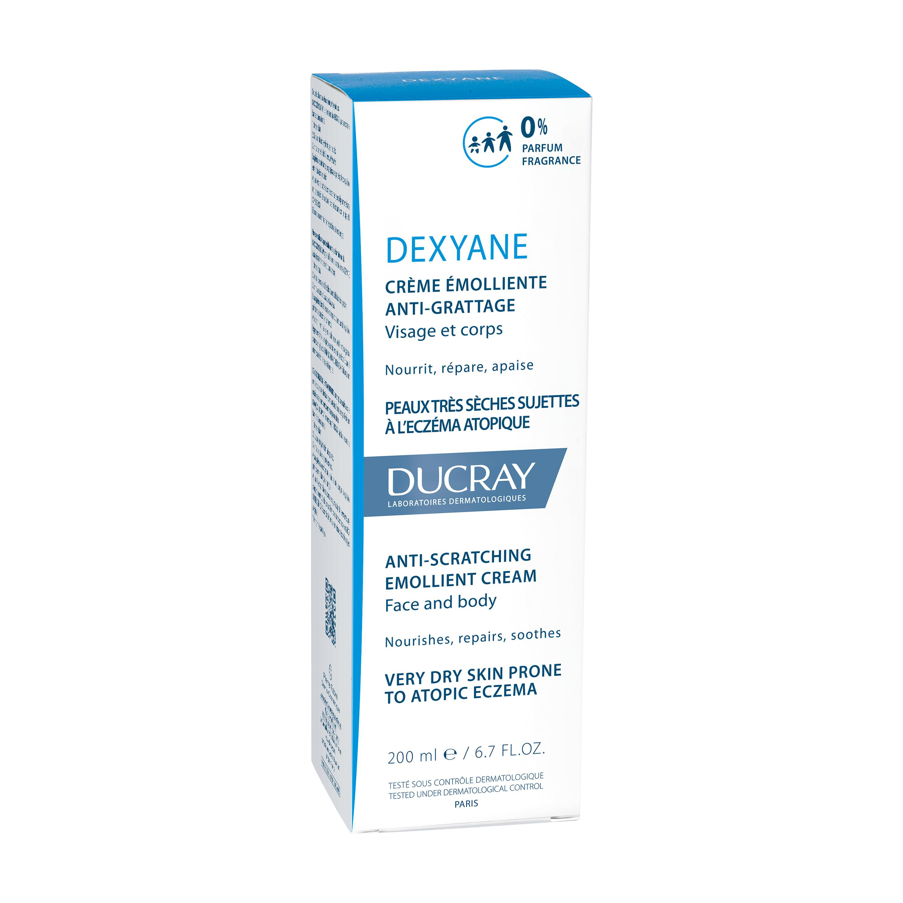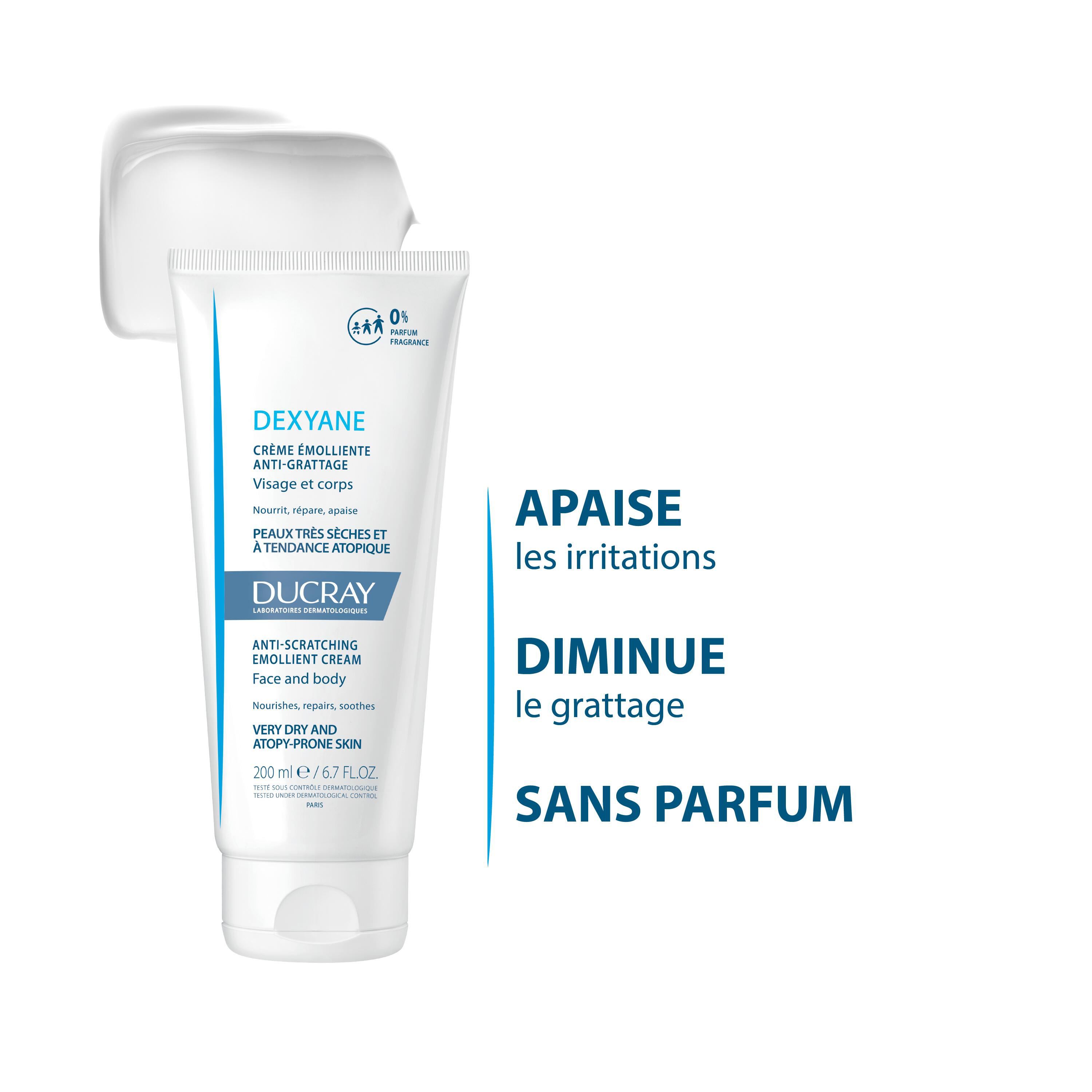 Ducray Dexyane Crème Emolliente Anti-Grattage 200 ml à la texture réconfortante est recommandée pour nourrir, réparer, apaiser les peaux très sèches à tendance atopique de toute la famille. Cette crème apaise les irritations dues à la sécheresse cutanée, nourrit, et répare efficacement votre peau, assurant un parfait équilibre entre hydratation et nutrition. La peau retrouve souplesse et confort immédiatement et durablement. Sa formule contient plusieurs ingrédients actifs : l'Hydroxydécine qui relance l'hydratation cutanée, le beurre de karité aux propriétés nourrissantes, et une phase hydra-nutritive (35%).