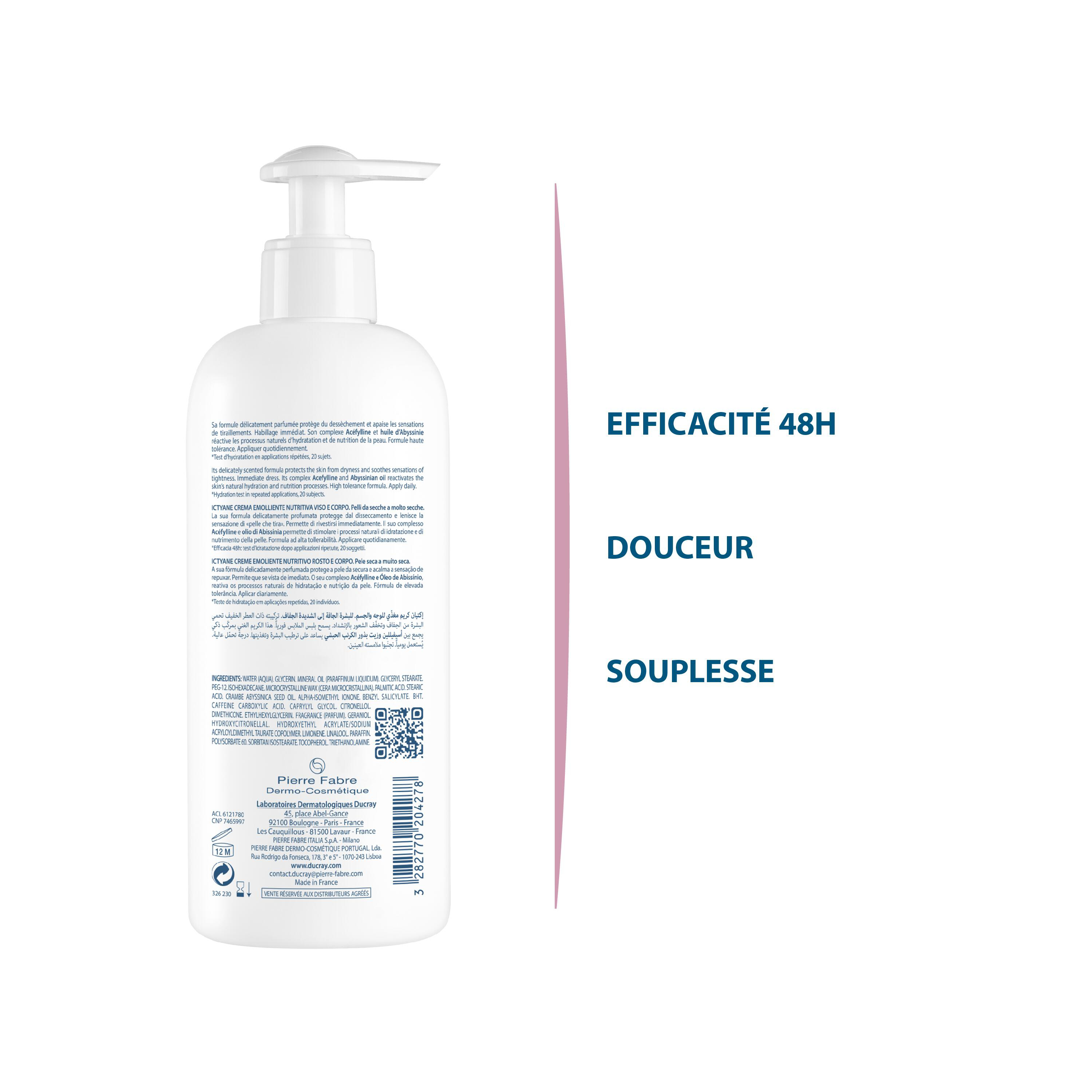 • Soin emblématique des Laboratoires Ducray, la crème émolliente nutritive ICTYANE a vu le jour il y a plus de 30 ans • Sa texture veloutée et son agréable parfum féminin enveloppent la peau d’un cocon de douceur • Sa formule à base d’ACE?FYLLINE et d’HUILE ABYSSINIE nourrit en profondeur les peaux sèches à très sèches • La peau est intensément hydratée pendant 48 heures • HYDRATE durablement la peau • LAISSE la peau douce et souple • UNE TEXTURE VELOURS et un parfum agréable. Apaise les sensations de tiraillement. Son Green Impact Index est B, on vous explique pourquoi. Le Green Impact index mesure l'impact environnemental et sociétal de nos produits à partir d'une note globale intégrant 20 critères. Le Green Impact Index ne mesure pas l’efficacité du produit, ni ses effets sur la santé de chacun, mais son respect de la nature et de la société dans son ensemble (éco-socio-conception). Chez Pierre Fabre, on estime qu’un produit commence à être éco-socio-conçu à partir d'une note B, même si l’objectif est à terme d’atteindre A. L’impact environnemental et sociétal de ce produit est : Emballage ne contenant pas de matière recyclée Packaging contenant des matériaux majoritairement recyclables Fabriqué dans une usine certifiée pour l’environnement*** ***Selon la norme ISO 14001 ou ECOVADIS