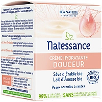 La crème hydratante douceur Bio de Natessance convient aux peaux normales à mixtes afin d'hydrater efficacement, tout en protégeant cette dernière des agressions extérieures du quotidien. Un duo d'actifs a été spécialement sélectionné pour sa formulation : la Sève d'érable bio, reconnue pour ses propriétés hydratantes et protectrices, permet d'adoucir la peau, notamment si cette dernière est fragilisées par diverses agressions. Son partenaire n'est autre que le Lait d'ânesse bio. Ce dernier, dont les vertus bienfaisantes sont reconnues, joue un rôle apaisant et protecteur, pour une sensation de confort tout au long de la journée. La crème hydratante douceur Natessance contient également de la glycérine, qui favorisera une hydratation durable, car elle permet de maintenir l'eau en surface de la peau. Dans sa formule, nous retrouvons divers agents aux propriétés adoucissantes, comme l'Eau florale de Camomille bio. Tous ces bienfaits sont regroupés dans cette crème à la texture légère, qui déposera un voile protecteur sur la peau, lui offrant ainsi une meilleure résistance aux agressions telles que la pollution, le froid, le soleil ... La peau est hydratée et apaisée durablement, pour un confort optimal.