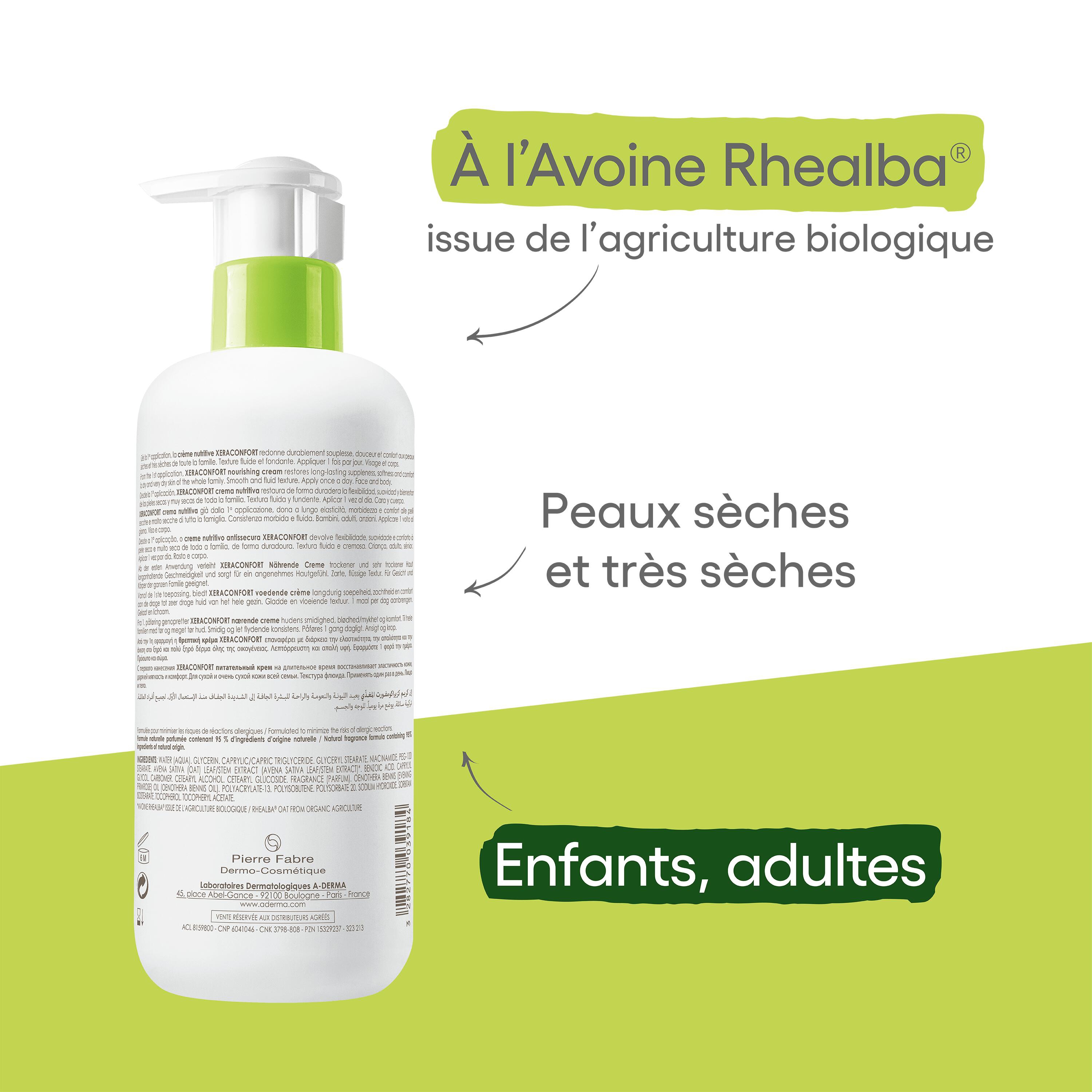 La xérose ou sécheresse cutanée touche particulièrement les seniors, mais aussi les adultes et les enfants. Cette crème lutte efficacement contre ce dessèchement. Ce soin hydrate, nourrit, réconforte et protège toutes les peaux fragiles, sensibles sèches et très sèches. XERACONFORT CRÈME NUTRITIVE ANTI-DESSÈCHEMENT possède également un effet rémanent : dès la première application, elle réduit de 94 % le prurit chez les sujets atteints de xérose². Ses vertus hydratantes, assouplissantes et protectrices proviennent d’actifs sécuritaires rigoureusement sélectionnés pour compenser le déficit lipidique. Sa formule à 95 % d’ingrédients d’origine naturelle est fidèle à l’engagement Clean & Green d’A-DERMA. Sa texture plaisir délicatement parfumée, crémeuse et fondante, s’étale facilement et ne laisse pas de film gras. La peau sèche est apaisée, nourrie et efficacement hydratée pour 24 h¹. Avoine Rhéalba® issue de l'agriculture biologique. Info Vegan : sans ingrédient d'origine animale. ¹ % de diminution de l’intensité de prurit dès la première application de la Crème nutritive XERACONFORT. Étude clinique sur 15 sujets de plus de 60 ans atteints de xérose.