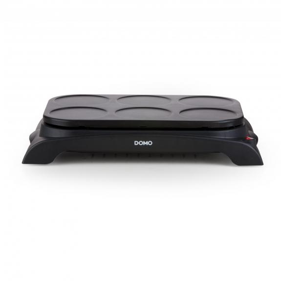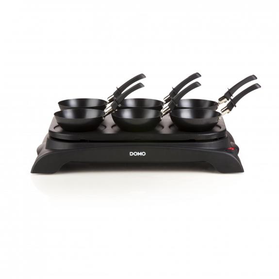 DO8710W - crêpière 1000w 6x12cm noir + 6 poêlons wok - La crêpe party grill DOMO DO9188G est idéal pour partager un moment convivial et chaleureux. Ses 6 poêlons woks et sa plaque de cuisson ont un revêtement antiadhésif qui vous assurera un nettoyage facile. Il peut également s'utiliser sans les poêlons wok pour réaliser de petites crêpes. L'appareil est fourni avec une cuillère à pâte. Sa puissance de 1000W et d'une capacité pour 6 personnes. La plaque de cuisson est en fonte de haute qualité avec revêtement antiadhésif.