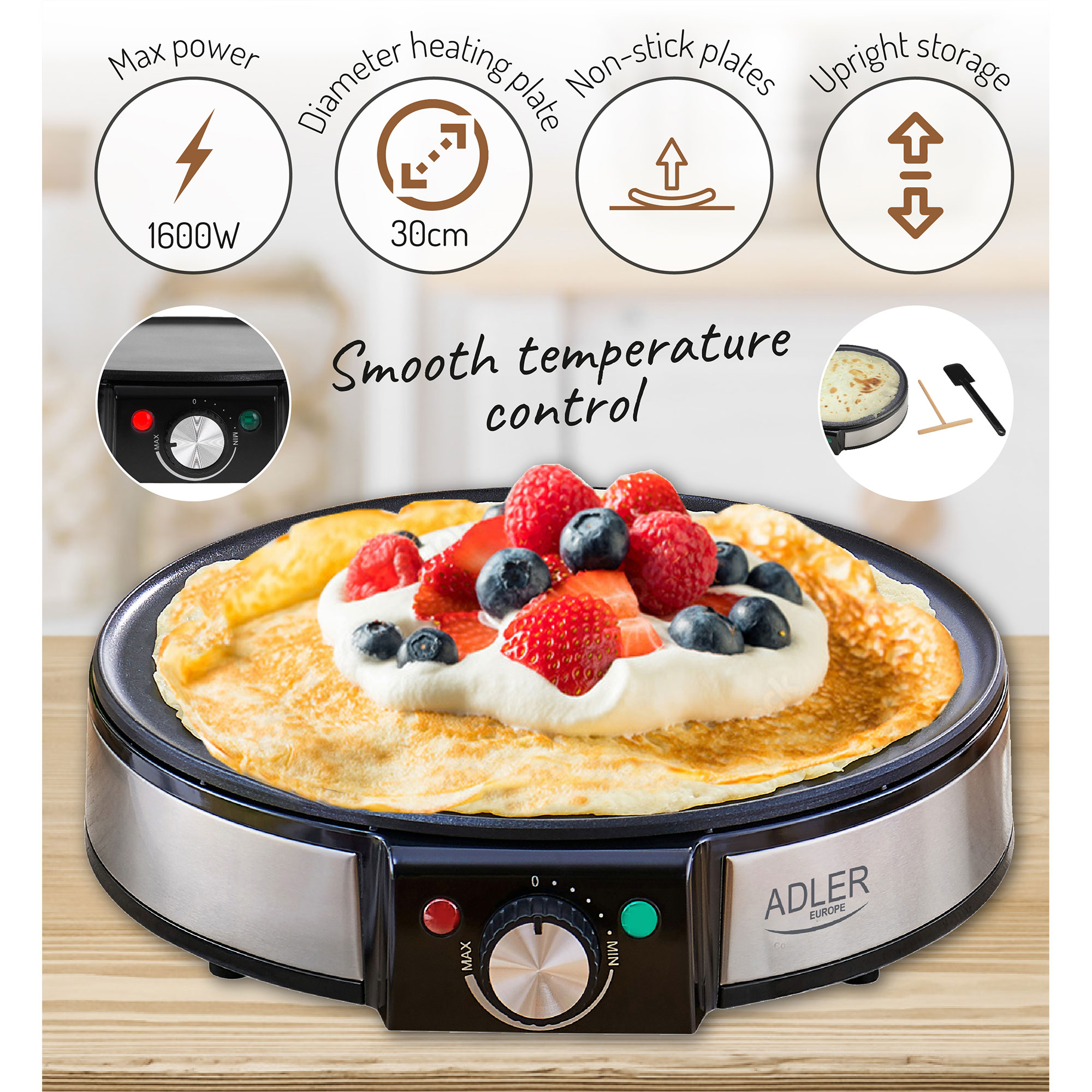 Crêpière, 30cm Diamètre, Revêtement Antiadhésif, Température Réglable 1600 Noir AdlerAD3058