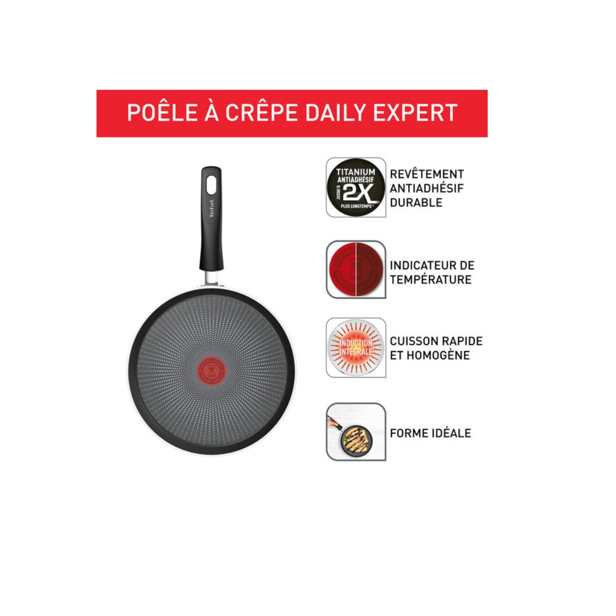 C2893802 - crêpière anti-adhésive 25 cm rouge - La poêle à crêpe antiadhésive Tefal c2893802 longue durée pour réussir facilement des crêpes parfaites. Avec la poêle à crêpes Daily Expert de Tefal, découvrez la cuisine maison sans effort. Cette poêle indispensable est équipée d'une poignée conçue pour une prise en main optimale et d'une forme idéale pour préparer des repas complets, et offre une expérience de cuisson à la maison plus agréable, avec les caractéristiques propres à Tefal pour des résultats parfaits jour après jour. Notre revêtement antiadhésif durable et sûr offre une glisse parfaite et un nettoyage facile, tandis que notre technologie innovante d'indicateur de température est la clé de délicieux repas qui sont parfaits à chaque fois.