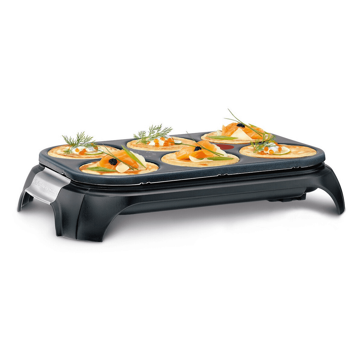Crêpes salées, crêpes sucrées ? Plaisir assuré ! Le tout dans un design épuré ! La Crep'party est doté d'une plaque pour réaliser 6 mini-crêpes (pancakes) Thermospot : Indique la température idéale de cuisson. Une fois la plaque parfaitement préchauffée et prête à la cuisson, la pastille devient entièrement rouge. Pratique: Les 3 plaques de cuisson possèdent un revêtement anti-adhésif Prometal. Le contour en thermoplastique isolant vous confère une utilisation sécurisée. Rangement : Son système de rangement ingénieux permet de stocker plaque et accessoires (spatules, louche et cordon) sous l'appareil. Cordon amovible : 2 mètres Puissance : 1000 Watts