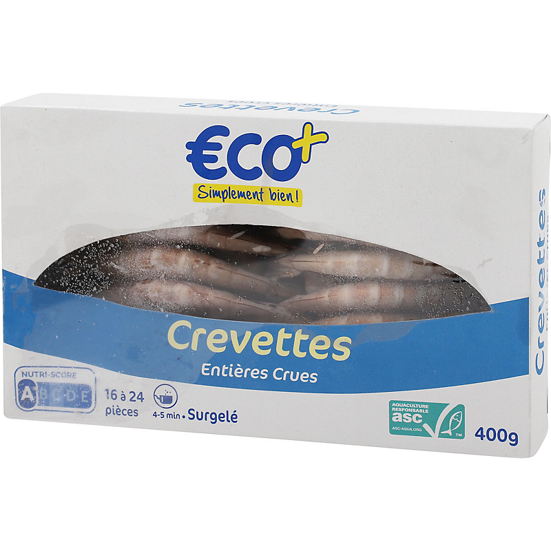 Crevettes (Penaeus vannamei) entières, crues, élevées en Inde, Surgelées. Nombre de pièces par étui : 16 à 24. ASC-C-01769 ECO +