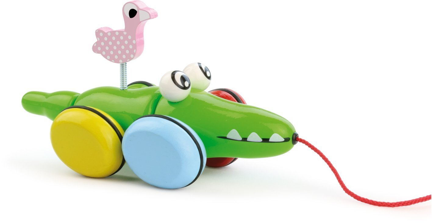 Croc le crocodile, accompagné de son amie Odile le flamand rose, se dandine lorsqu'on le traîne. Jouet à traîner en bois laqué. Fabrication française.