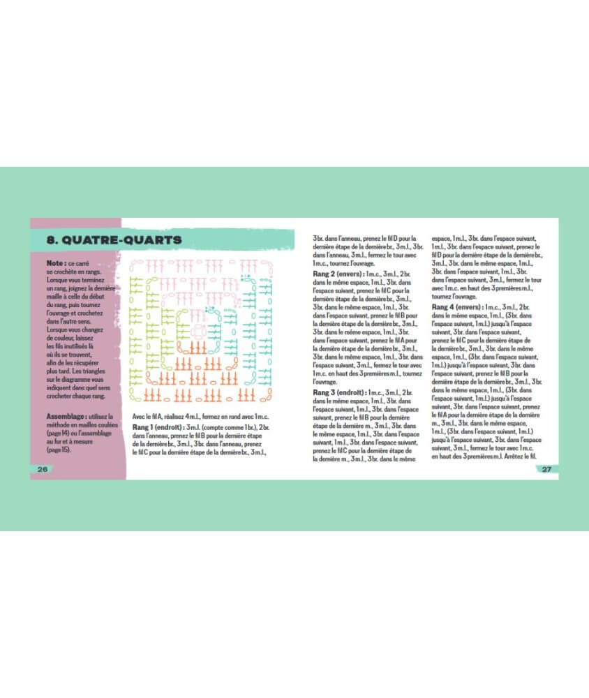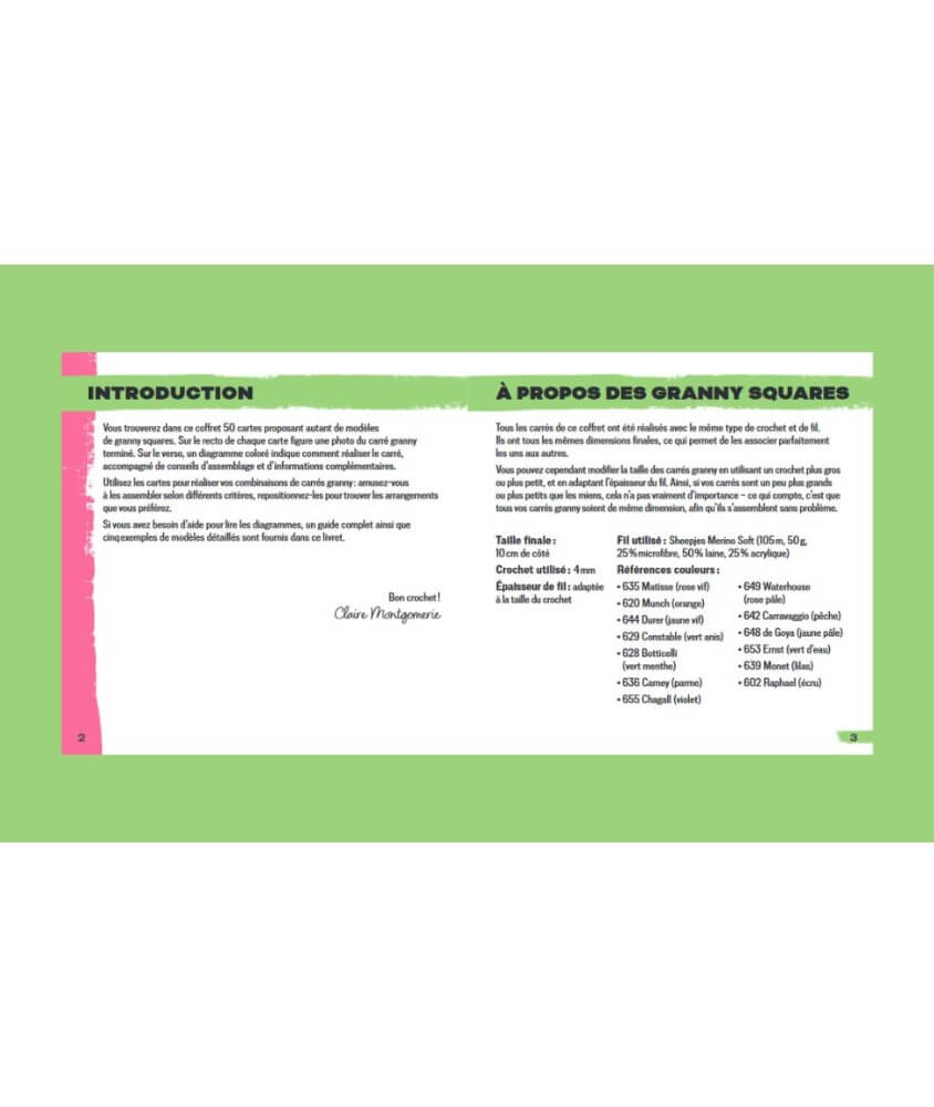 Ce coffret contient 50 modèles de granny squares à crocheter, du plus simple au plus sophistiqué. Au recto de chaque carte figure la photo du modèle à taille réelle ; au verso, son diagramme. Toutes les techniques de crochet et les indications pour lire les diagrammes sont réunies dans un petit livre de 32 pages inclus dans le coffret. Le principe des cartes avec modèles à taille réelle permet d’envisager une infinité de projets sur la base du mix and match : on compose son assemblage sur-mesure en associant les designs et on peut ainsi visualiser le rendu avant de se lancer. À chacune son pattern !