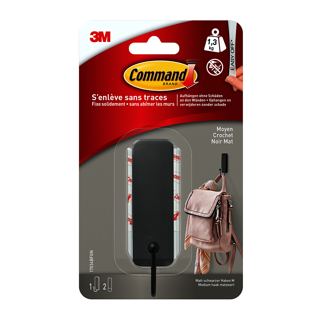 Crochet métal noir Déco Command™ moyen modèle. Avec la technologie Command™, oubliez les clous, vis, punaises qui abîment les murs ! Les crochets Déco Command™ permettent d’accrocher et d’organiser les objets facilement et solidement, sans outil et sans trou. Ils s'enlèvent sans laisser de trace, ni de trous et ni de résidus collants. Poids maximum supporté : 1,3kg.