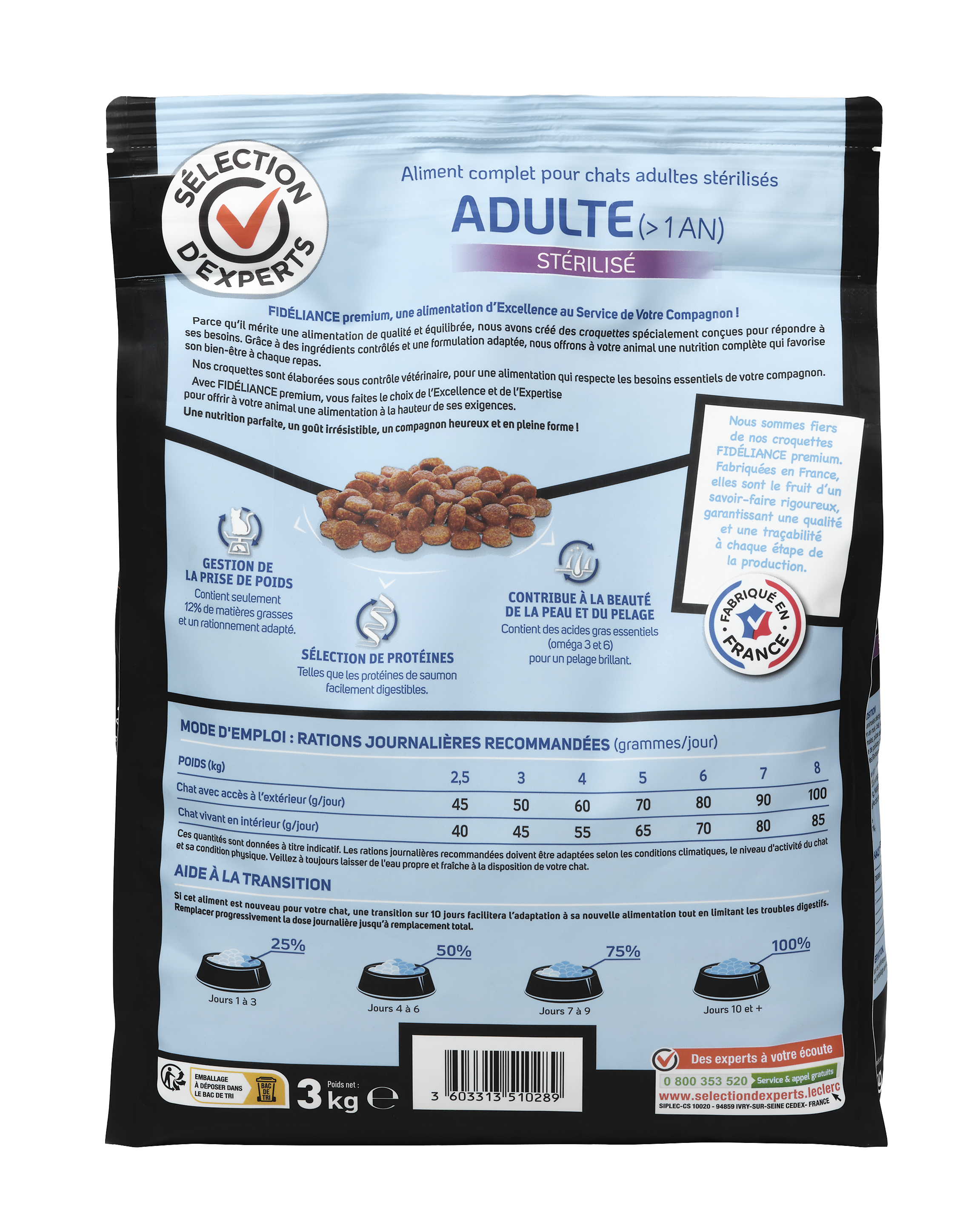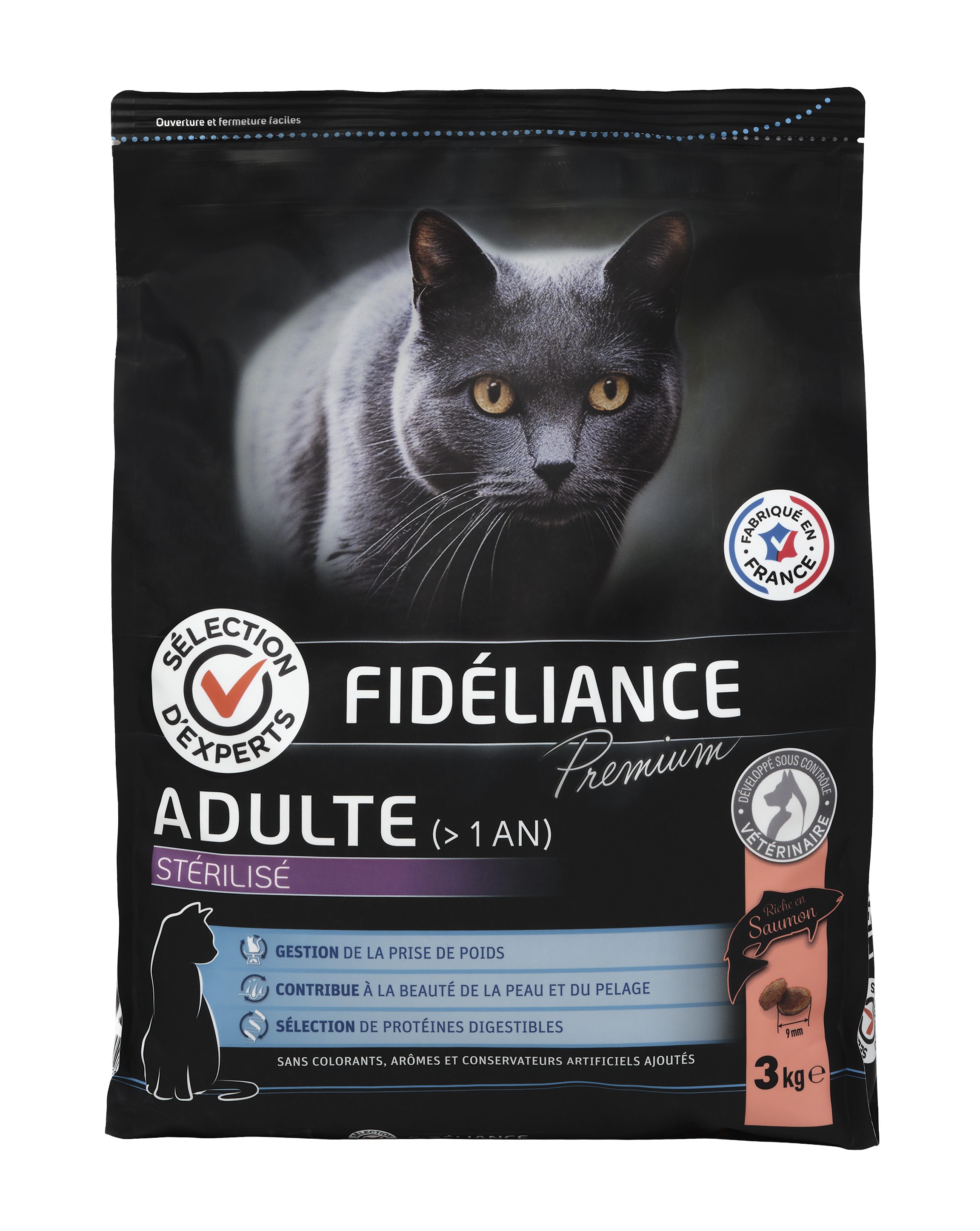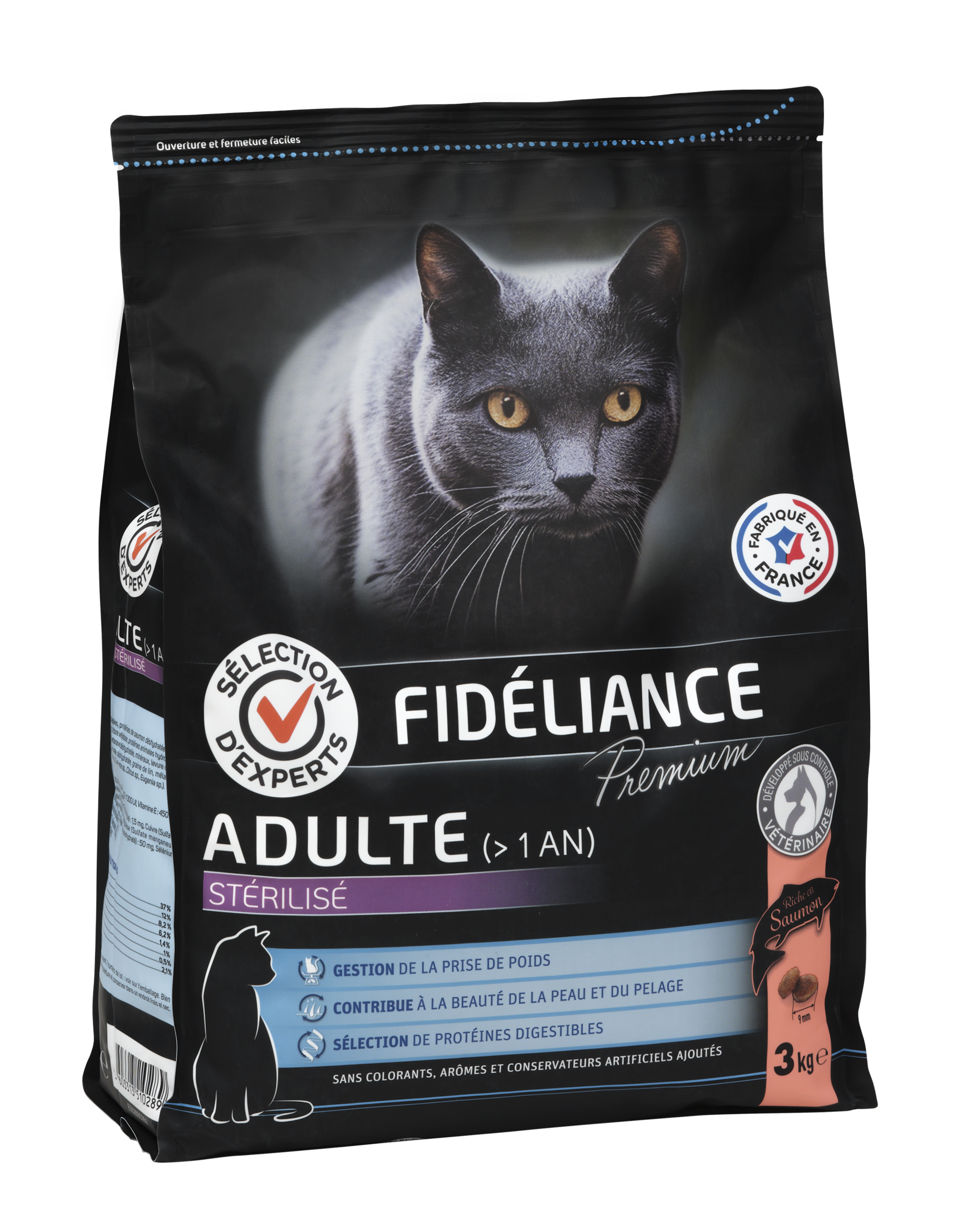 | Libellé | Croquettes chat adulte stérilisé riche en saumon, 3kg - Sélection d'Experts - Fidéliance Premium |