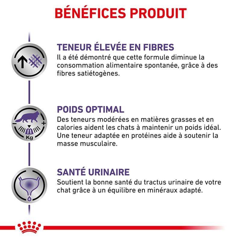 - Leur association d'une formule réduite en calories et en graisses, riche en fibres et d'un rationnement précis favorise le maintien du poids idéal des chats ayant tendance à l'embonpoint.