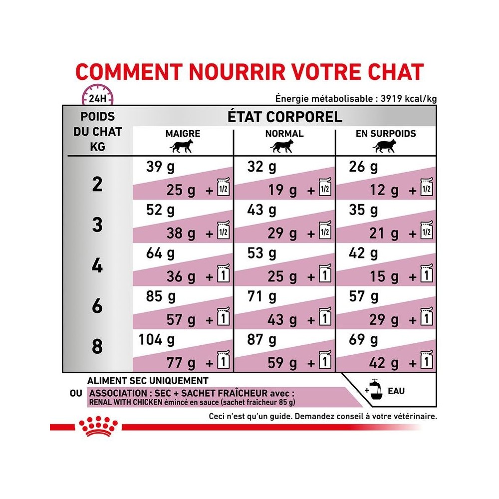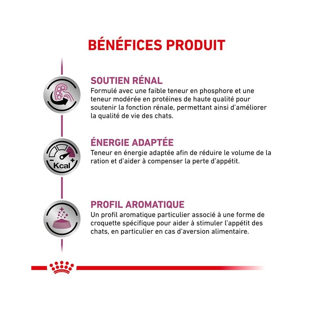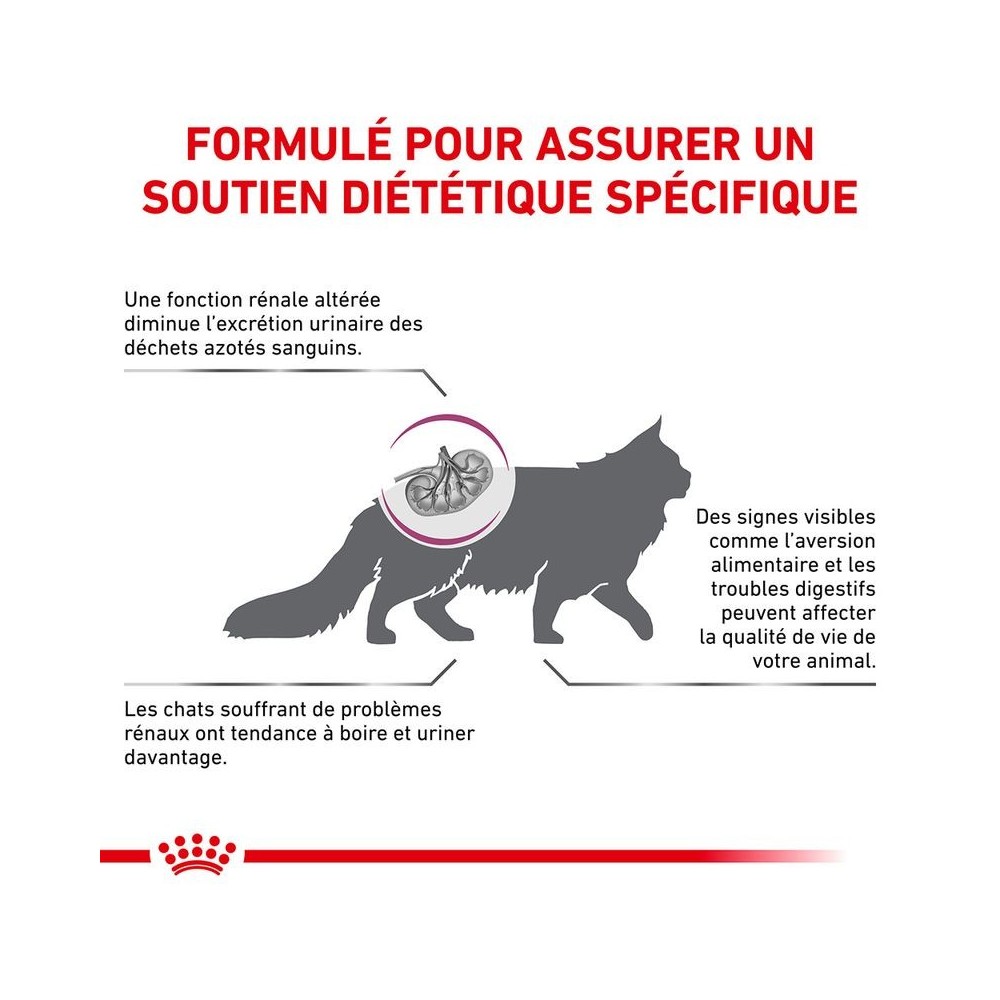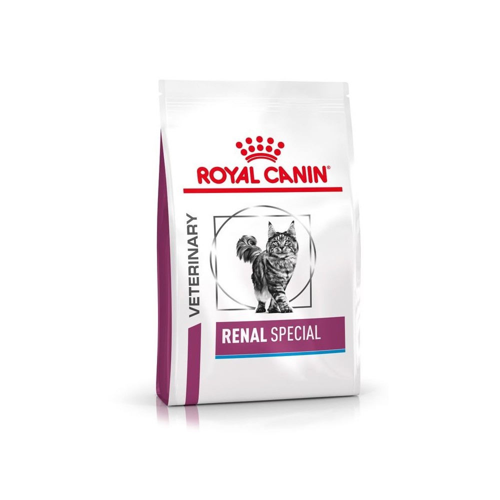 Les croquettes chat ROYAL CANIN VETERINARY CAT RENAL SPECIAL sont des croquettes complètes chat destinées à soutenir la fonction rénale en cas d'insuffisance rénale chronique, grâce à sa teneur réduite en phosphore et en protéines de haute qualité. Elles sont également indiquées pour la réduction de la formation des calculs d'oxalate, en raison de leur faible teneur en calcium et vitamine D, et de leurs propriétés d'alcalinisation de l'urine. Il est recommandé de demander l'avis d'un vétérinaire avant de les donner à votre chat. Utiliser au départ VETERINARY CAT RENAL SPECIAL pour période maximale allant jusqu'à 6 mois en cas d'insuffisance rénale chronique et réduction de la formation des calculs d'oxalate.