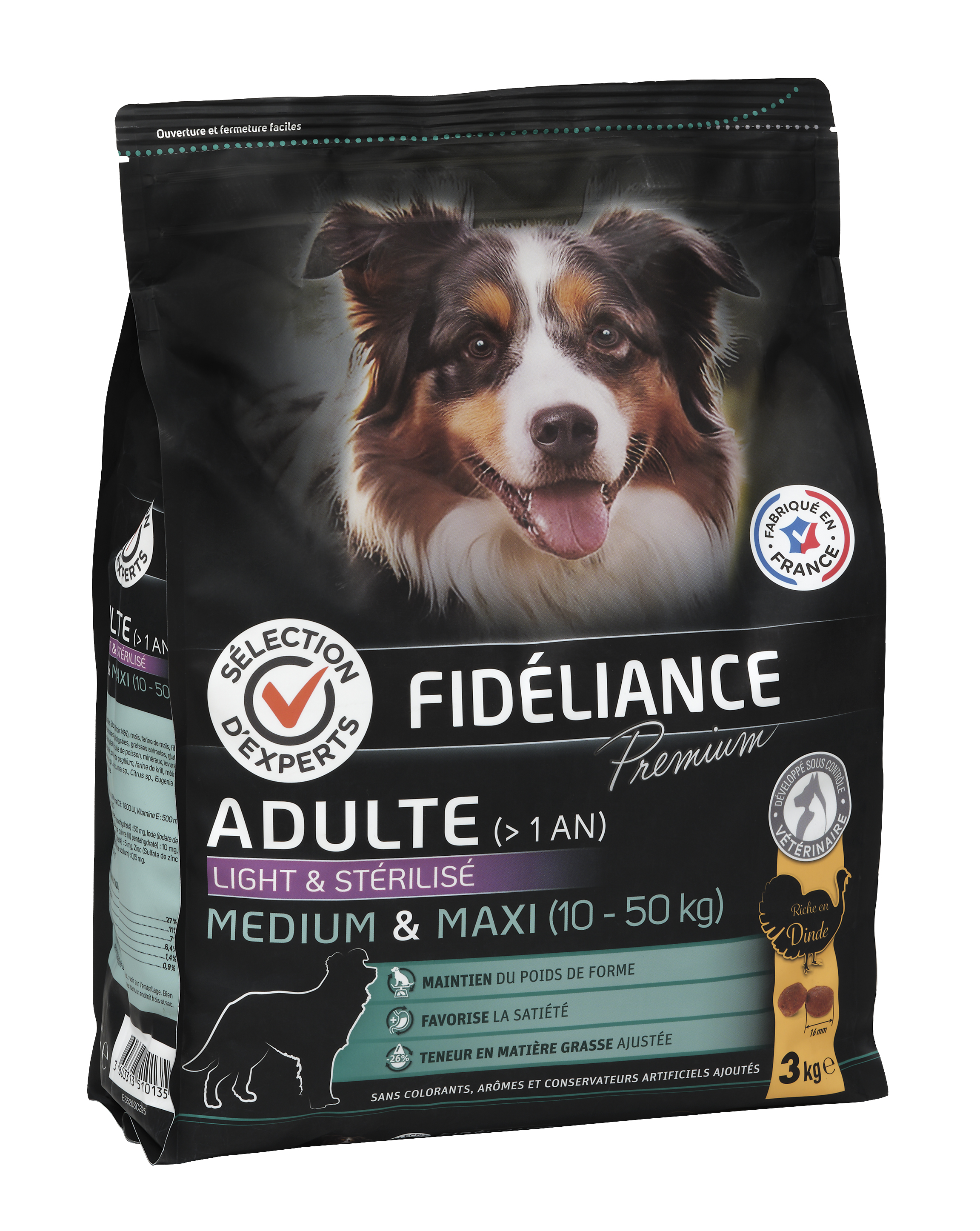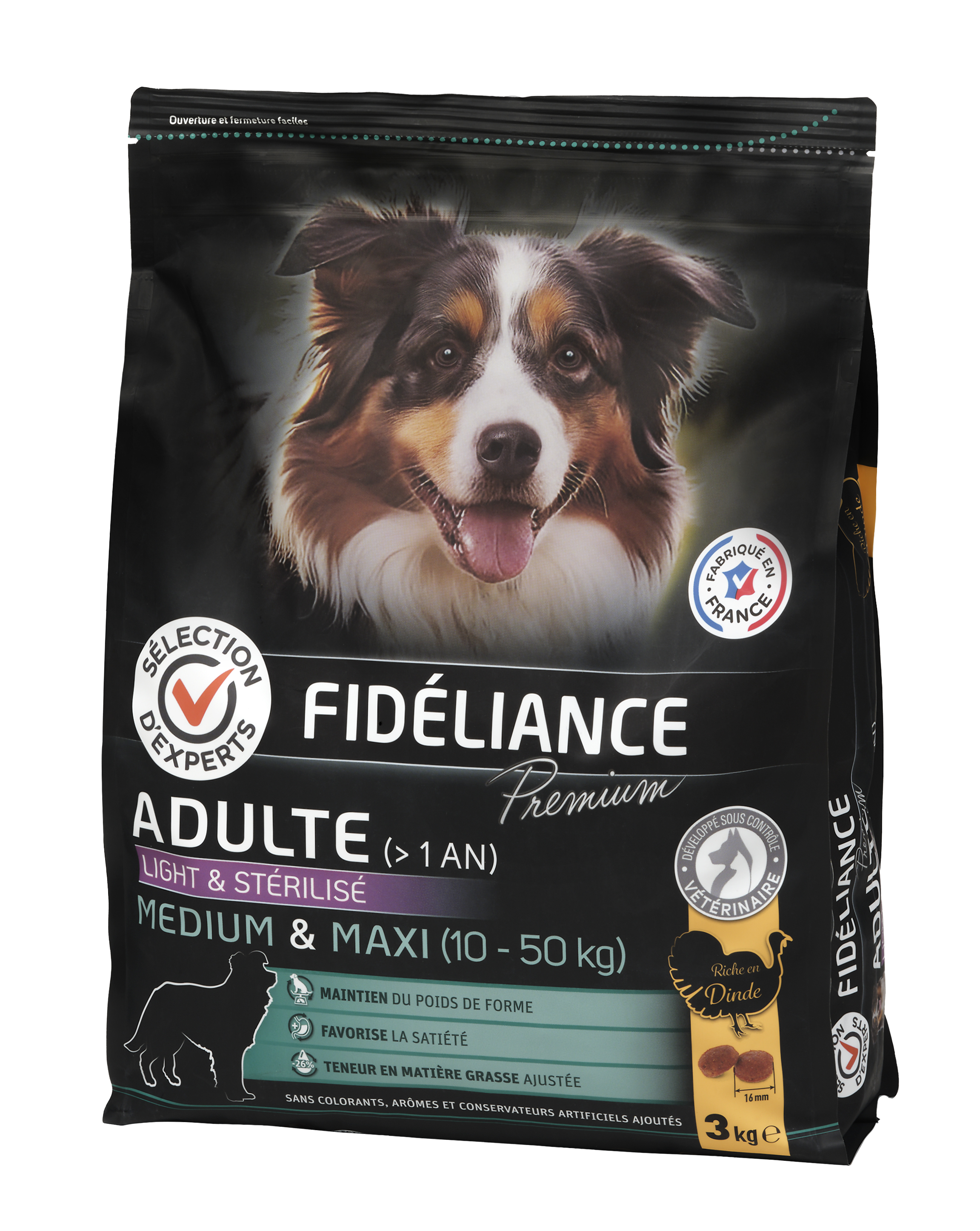 Fidéliance Premium, une alimentation d'excellence au service de votre compagnon ! - Aliment complet pour chiens adulte MEDIUM & MAXI - light & stérilisé - Riche en dinde - Développé sous contrôle vétérinaire - Elaboré et produit en FRANCE - Sans colorants, arômes et conservateurs artificiels ajoutés