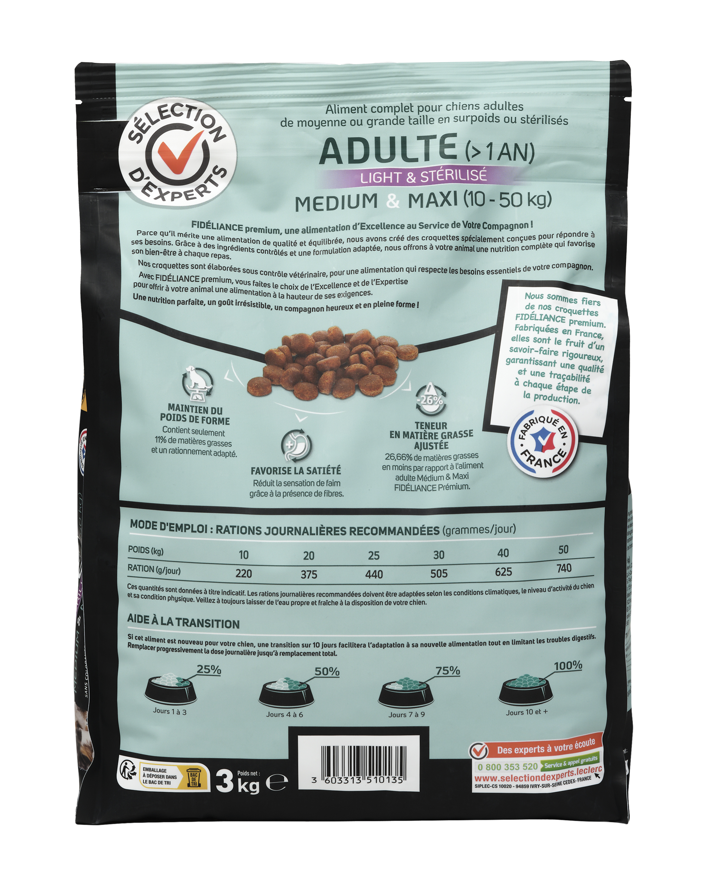 | Libellé | Croquettes chien adulte riche en dinde light & stérilisé, Medium & Maxi, 3kg - Sélection d'Experts - Fidéliance Premium |