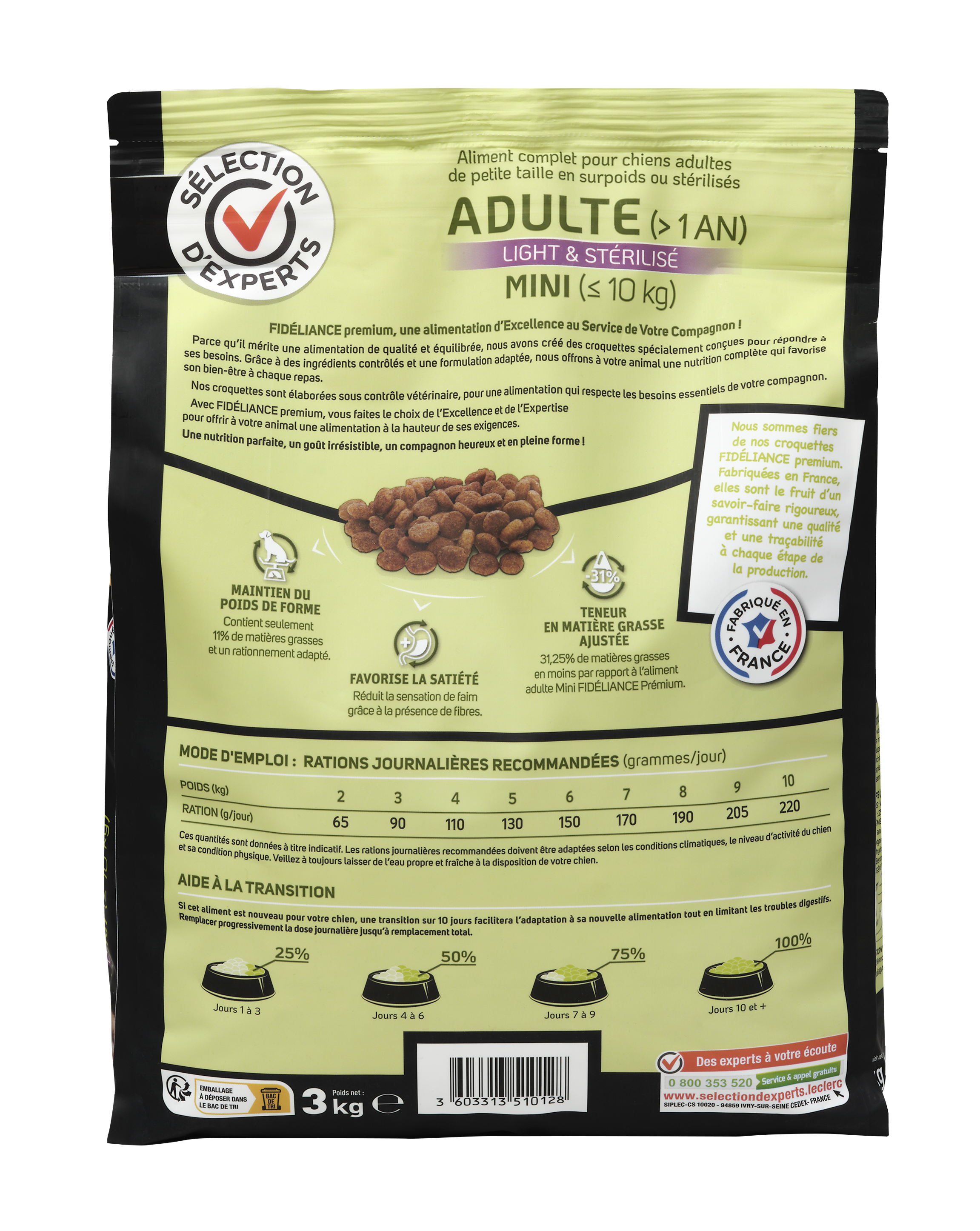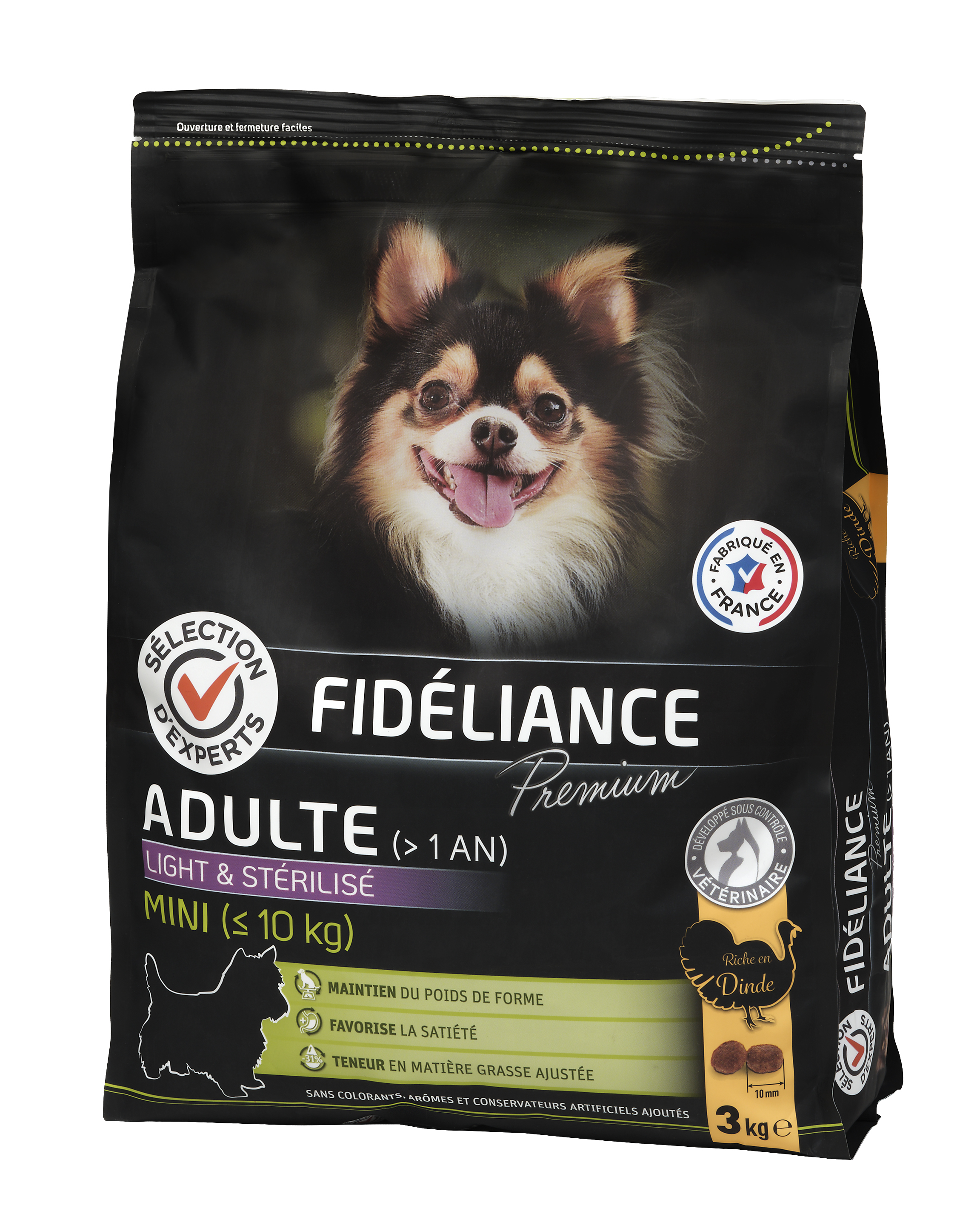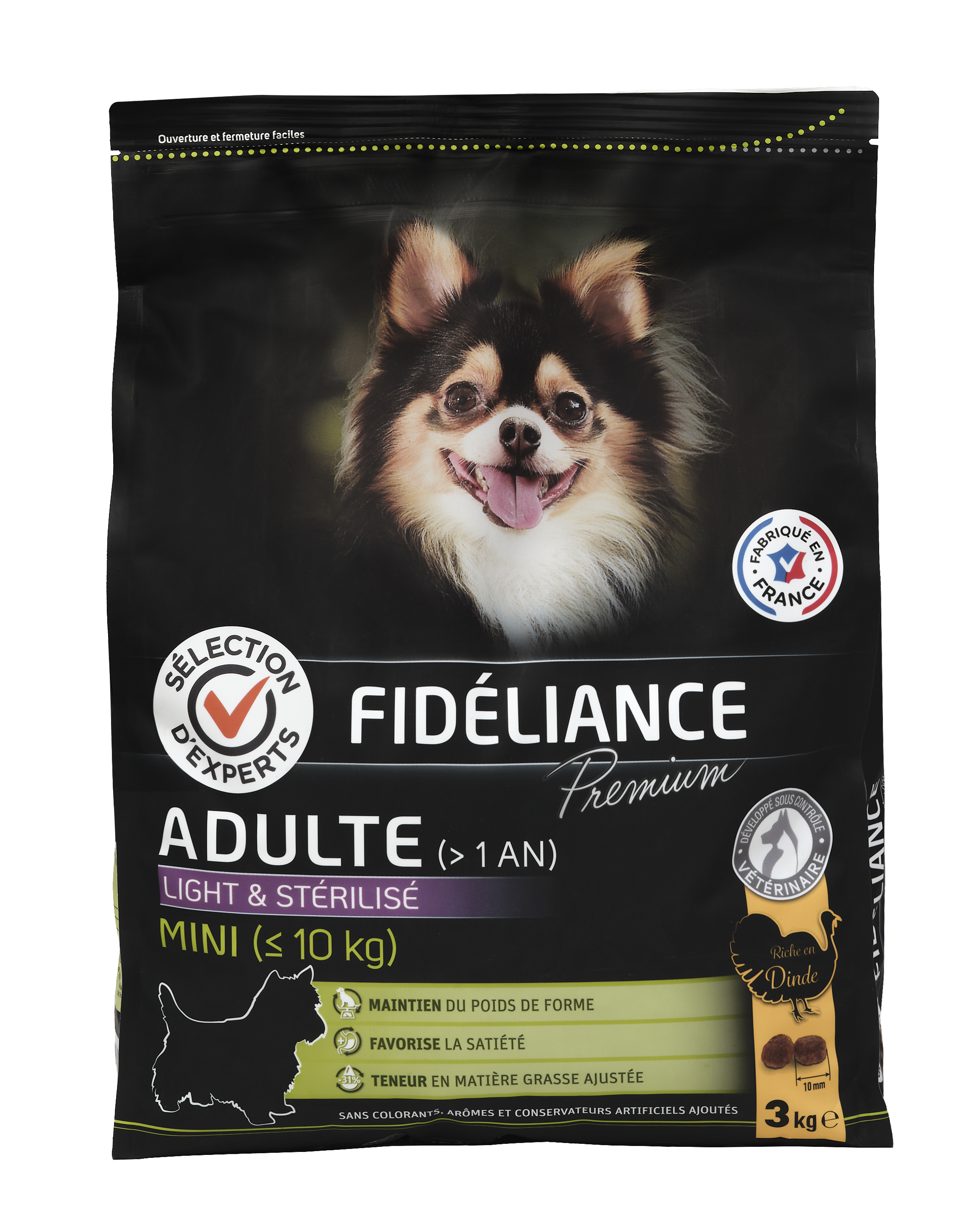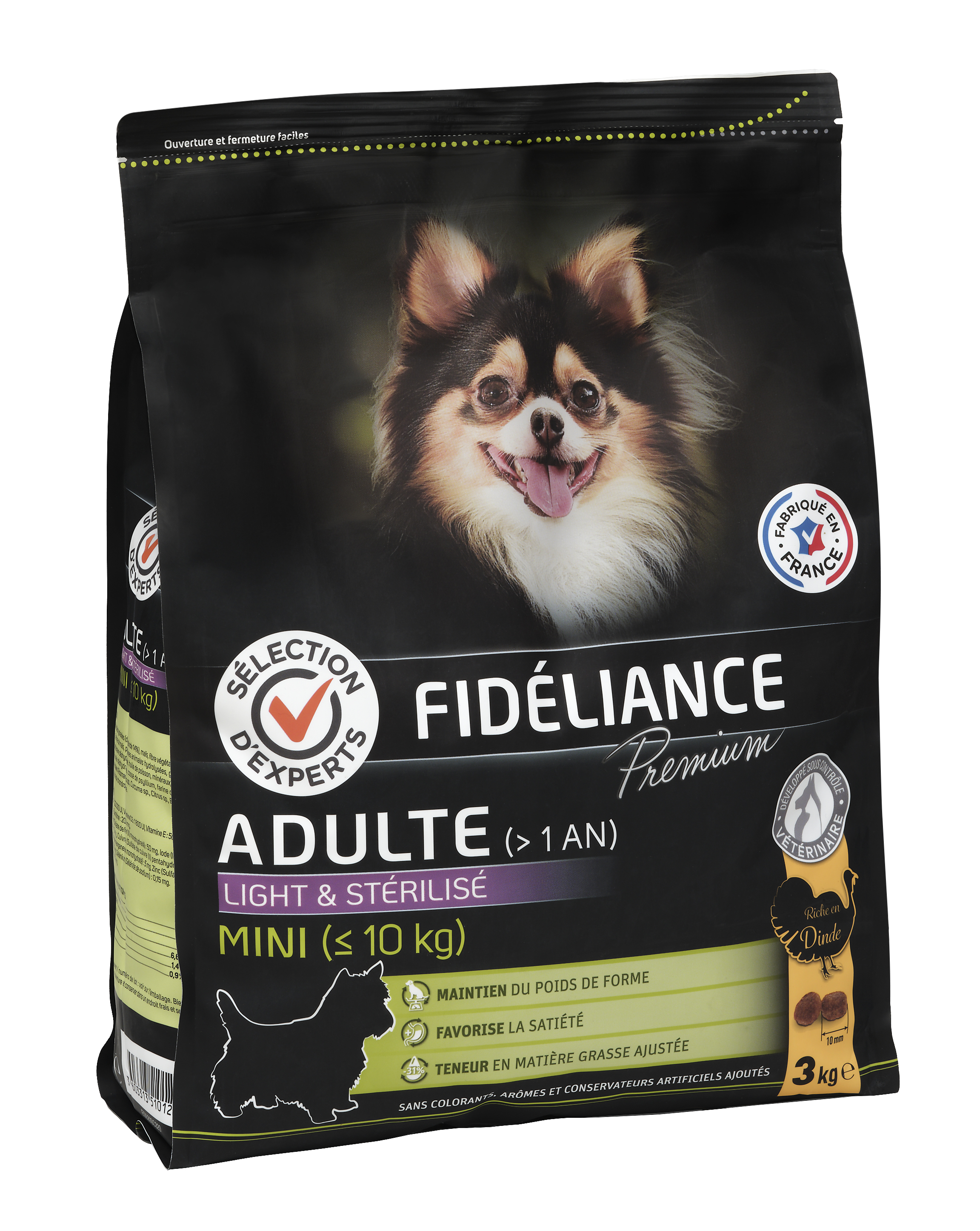 | Libellé | Croquettes chien adulte riche en dinde light & stérilisé, Mini, 3kg - Sélection d'Experts - Fidéliance Premium |