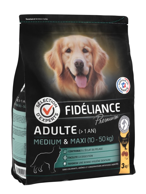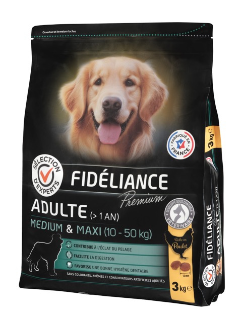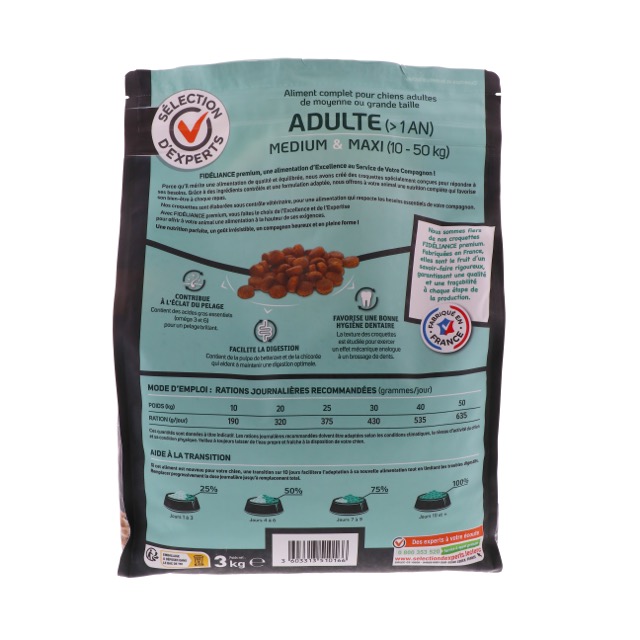 | Libellé | Croquettes chien adulte riche en poulet, Medium & Maxi, 3kg - Sélection d'Experts - Fidéliance Premium |