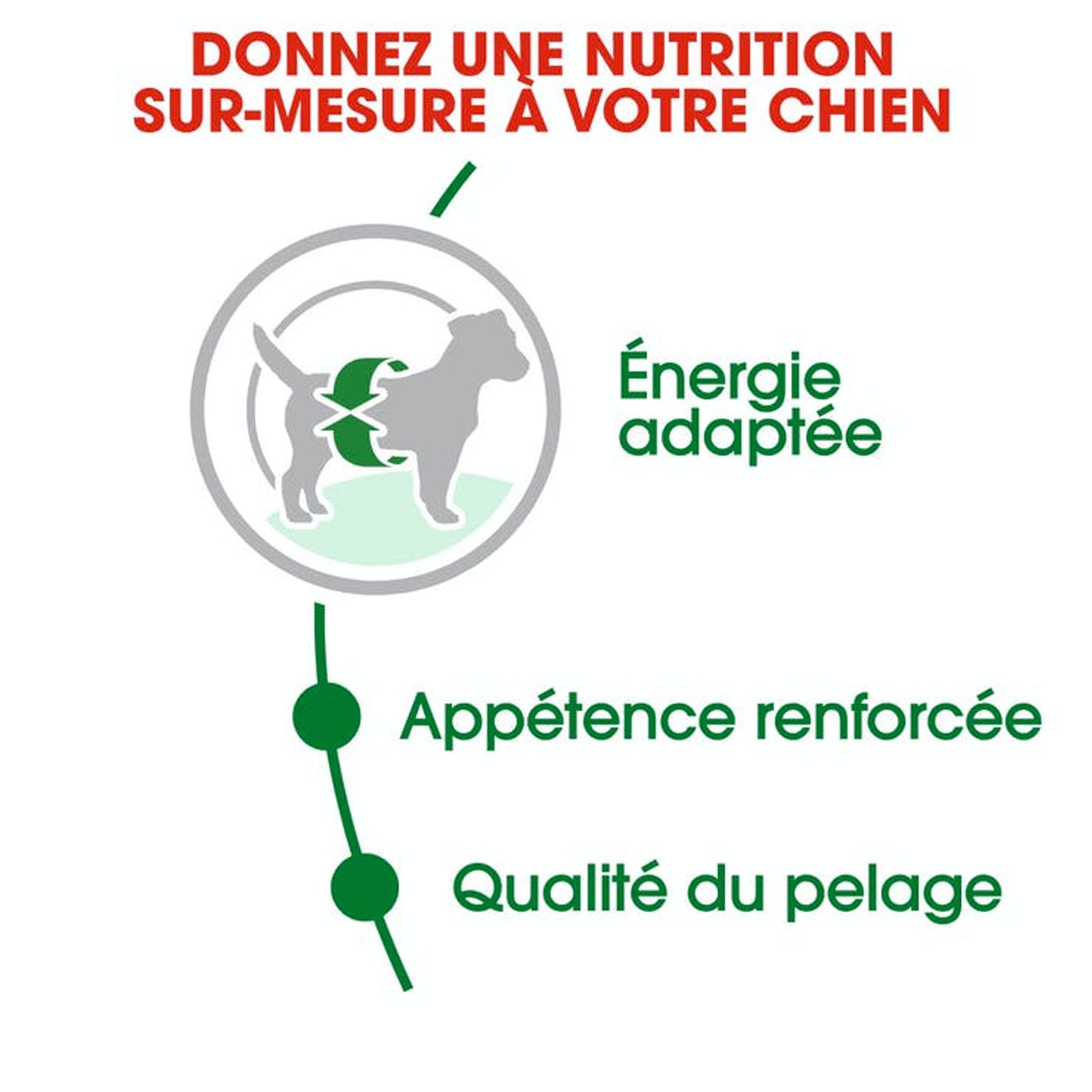 LES roquettes Royal Canin Mini Adulte sont spécialement formulées pour les chiens de petites races à l'âge adulte à partir de 10 mois.Petites croquettes étoilées pour les mâchoires des petites races Croquettes Chien Royal Canin Mini Adulte Recommandées pour les chiens de petite taille à partir de 10 mois et pesant jusqu'à 10 kg Haute densité énergétique pour répondre aux besoins élevés de votre petit chien Aide à maintenir un poids idéal pour la santé de votre chien de petite race Très haute appétence : les petits chiens ont parfois tendance à avoir un appétit difficile Enrichi en EPA-DHA pour une peau saine et un pelage brillant A partir de 8 ans nous vous conseillons de passer sur les croquettes Royal Canin Mini Mature.