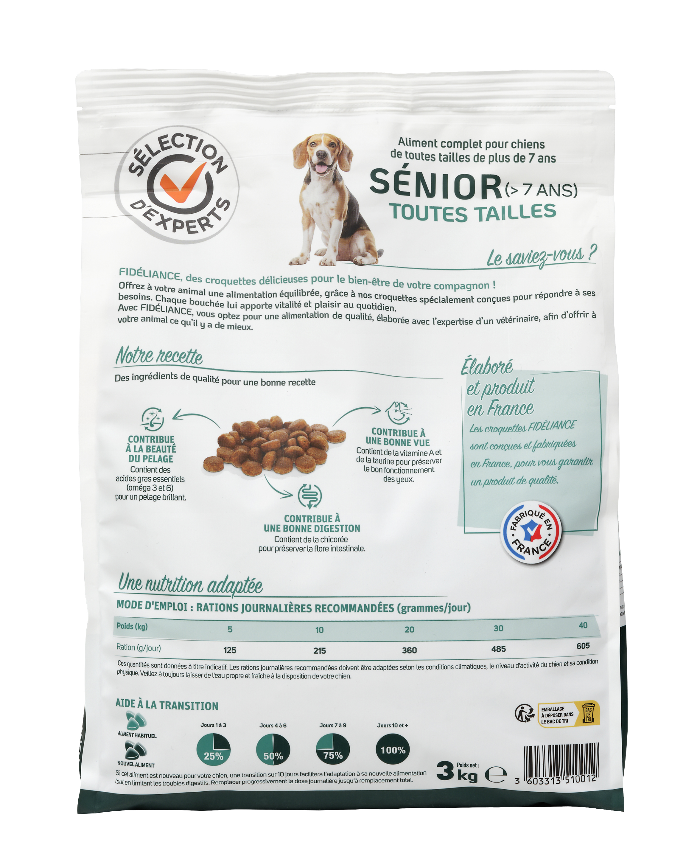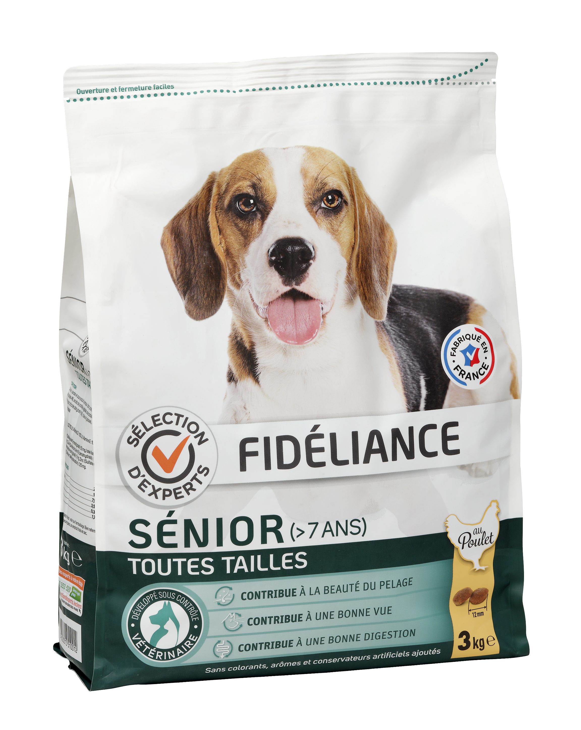 | Libellé | Croquettes chien sénior au poulet, Toutes tailles, 3kg - Sélection d'Experts - Fidéliance |