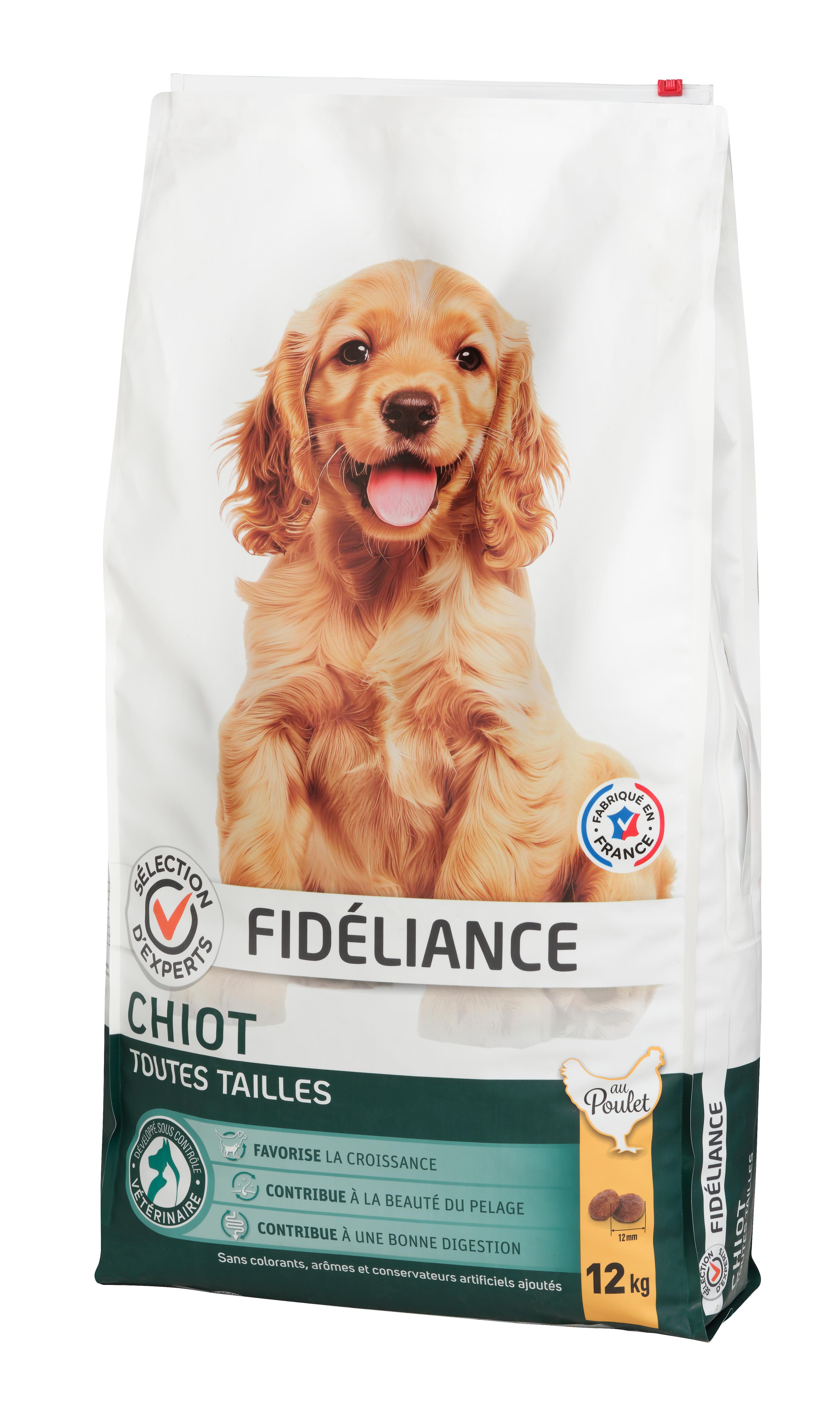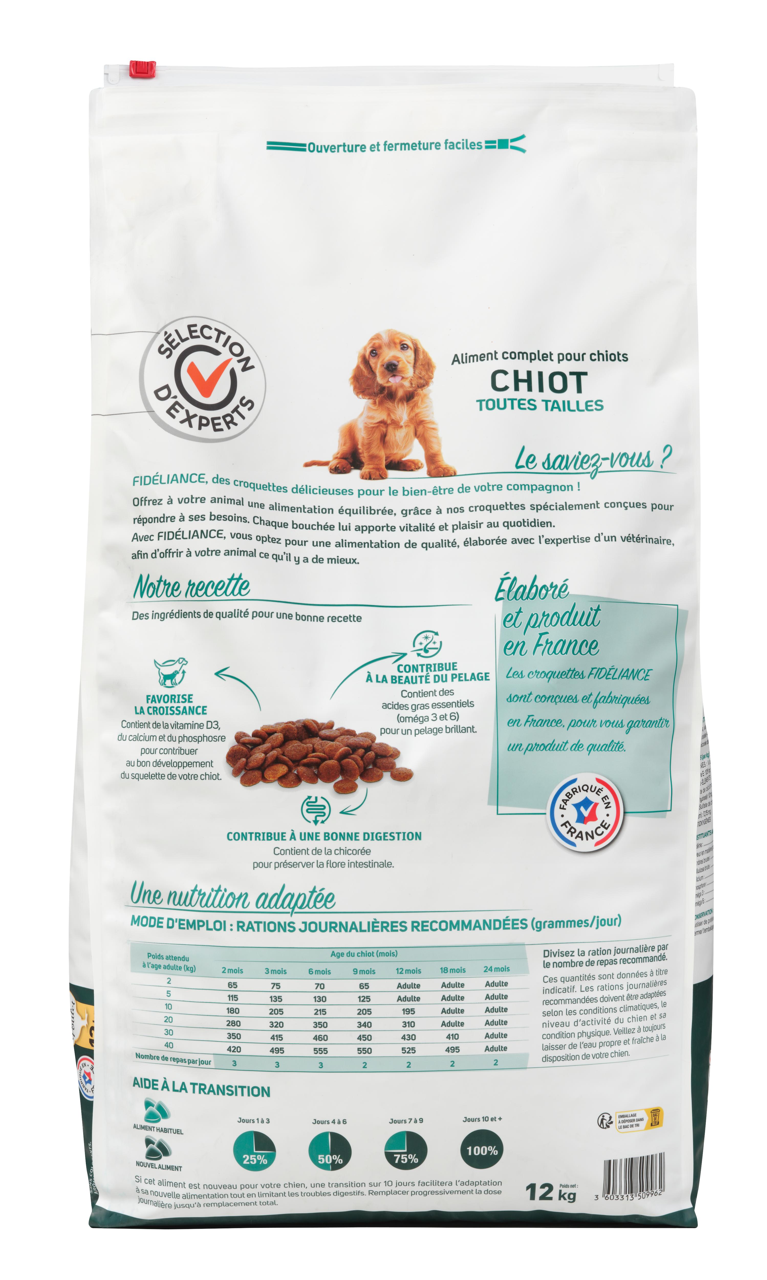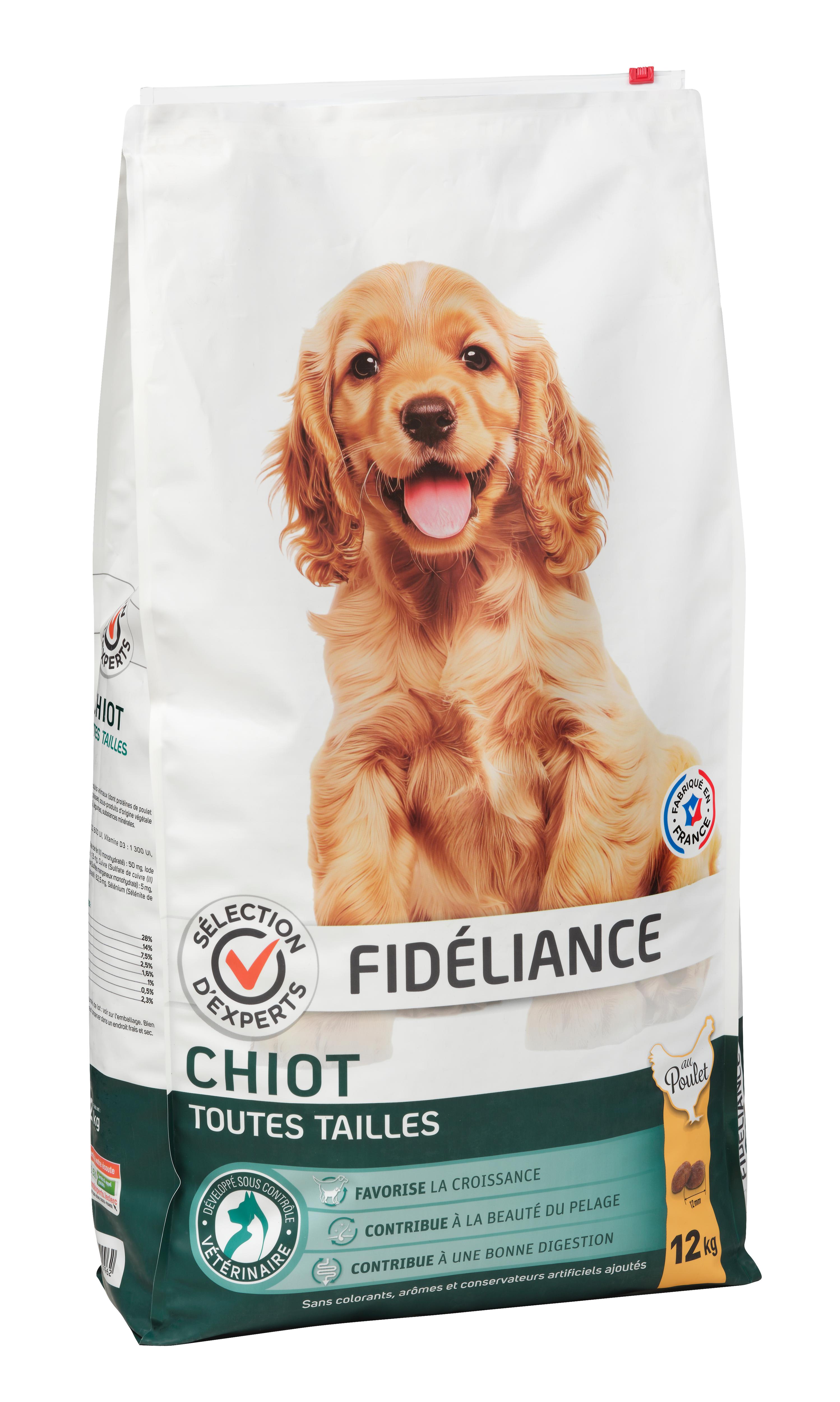 | Libellé | Croquettes chiot au poulet, Toutes tailles, 12kg - Sélection d'Experts - Fidéliance |