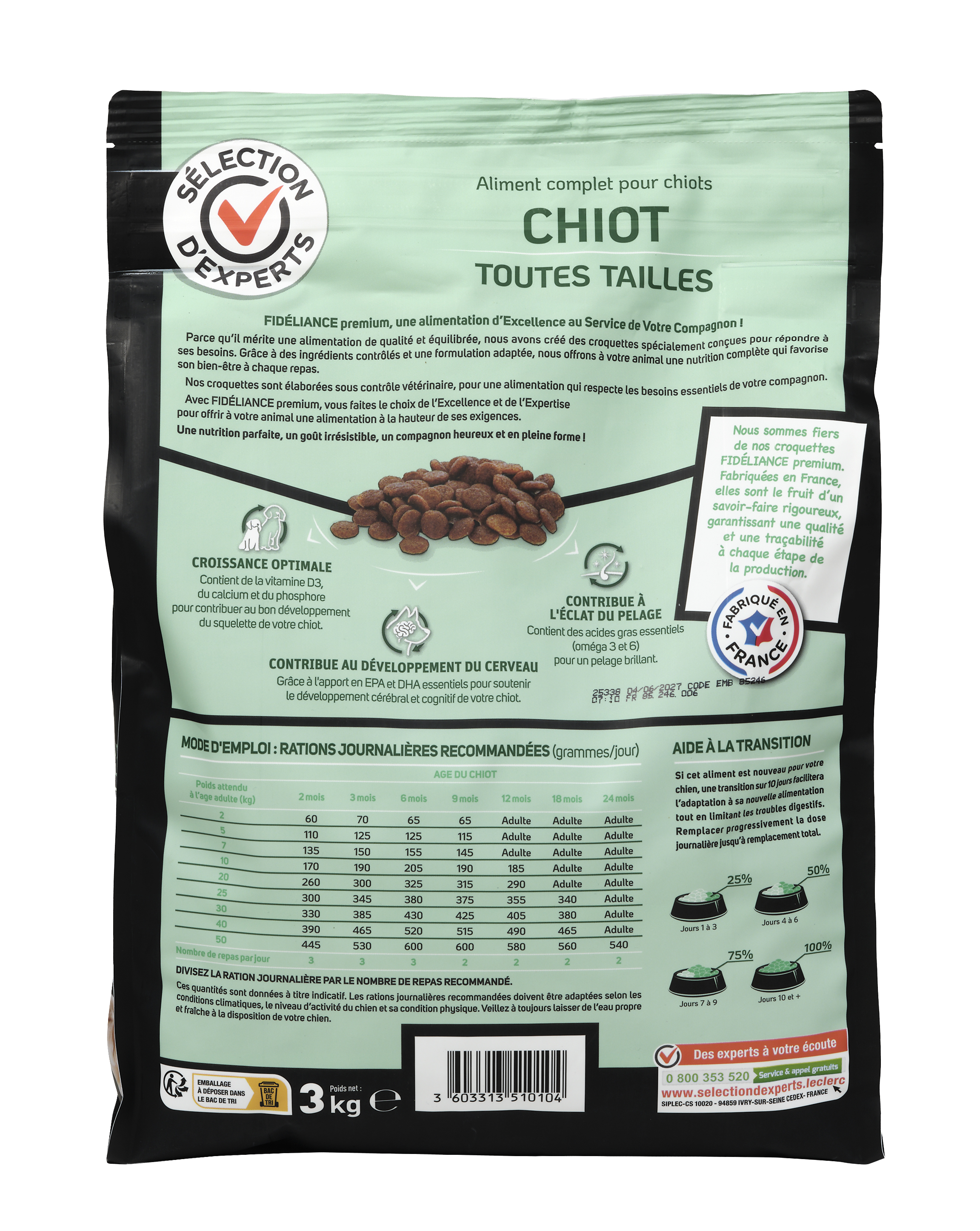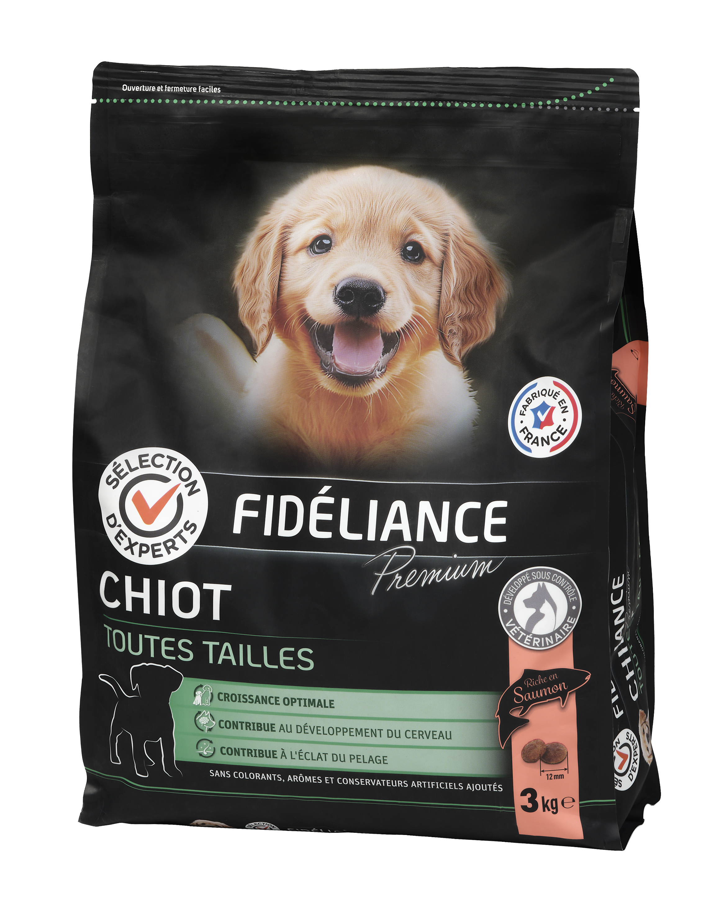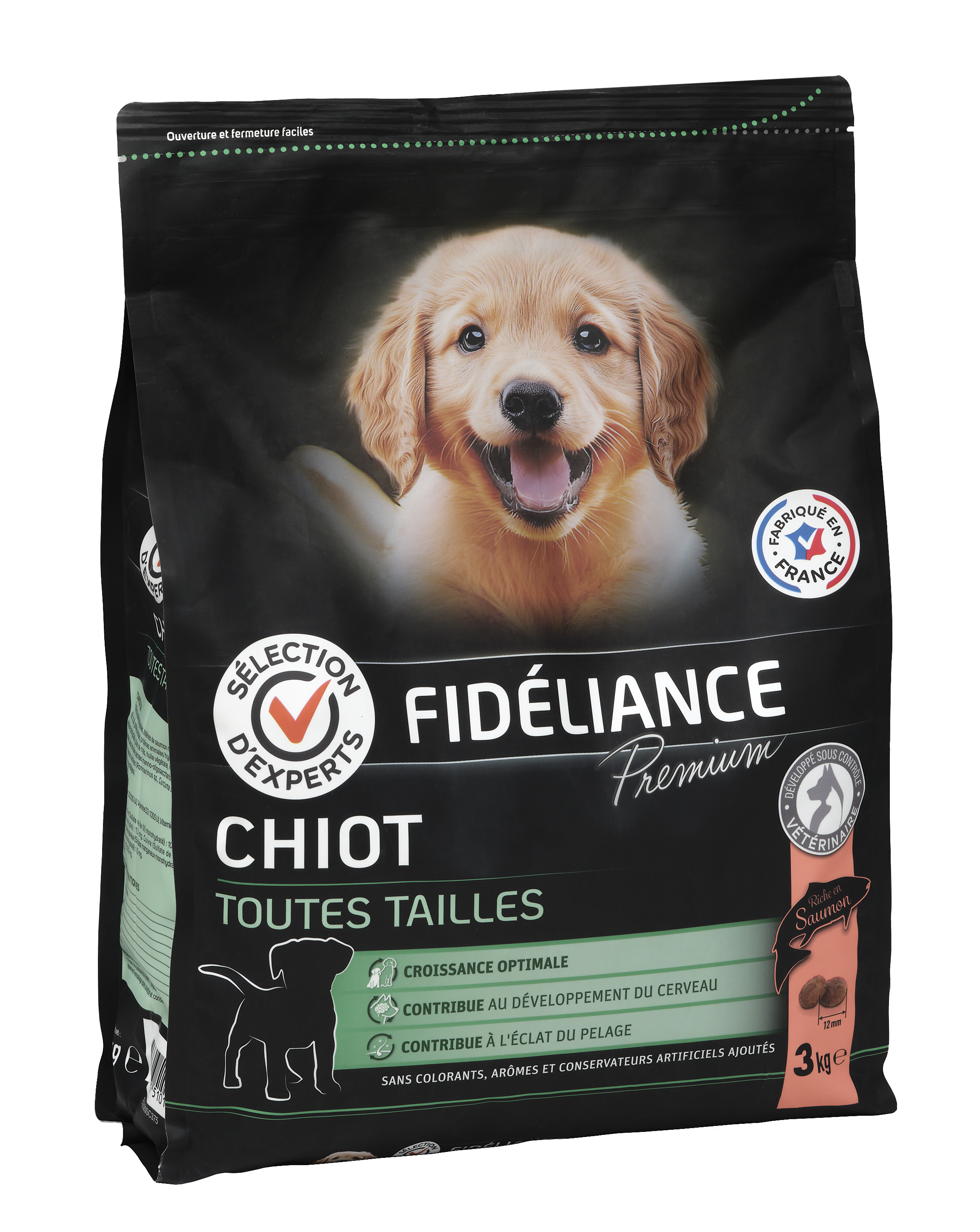 | Libellé | Croquettes chiot riche en saumon, Toutes tailles, 3kg - Sélection d'Experts - Fidéliance Premium |