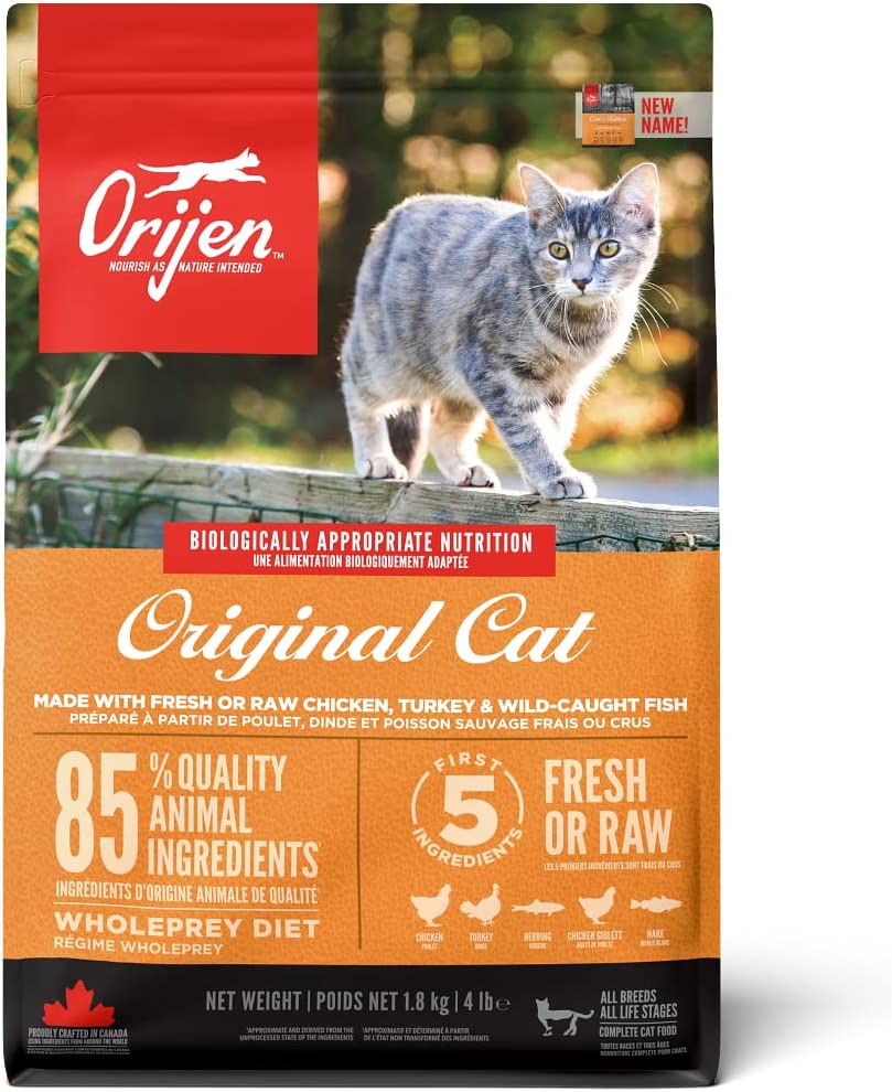 Croquettes sans céréales Original pour Chat Orijen. Les croquettes sans céréales pour chat Orijen est une nourriture 100% naturelle et contient une proportion élevée d'ingrédients carnés hyper protéinés convenant au régime alimentaire du carnivore..