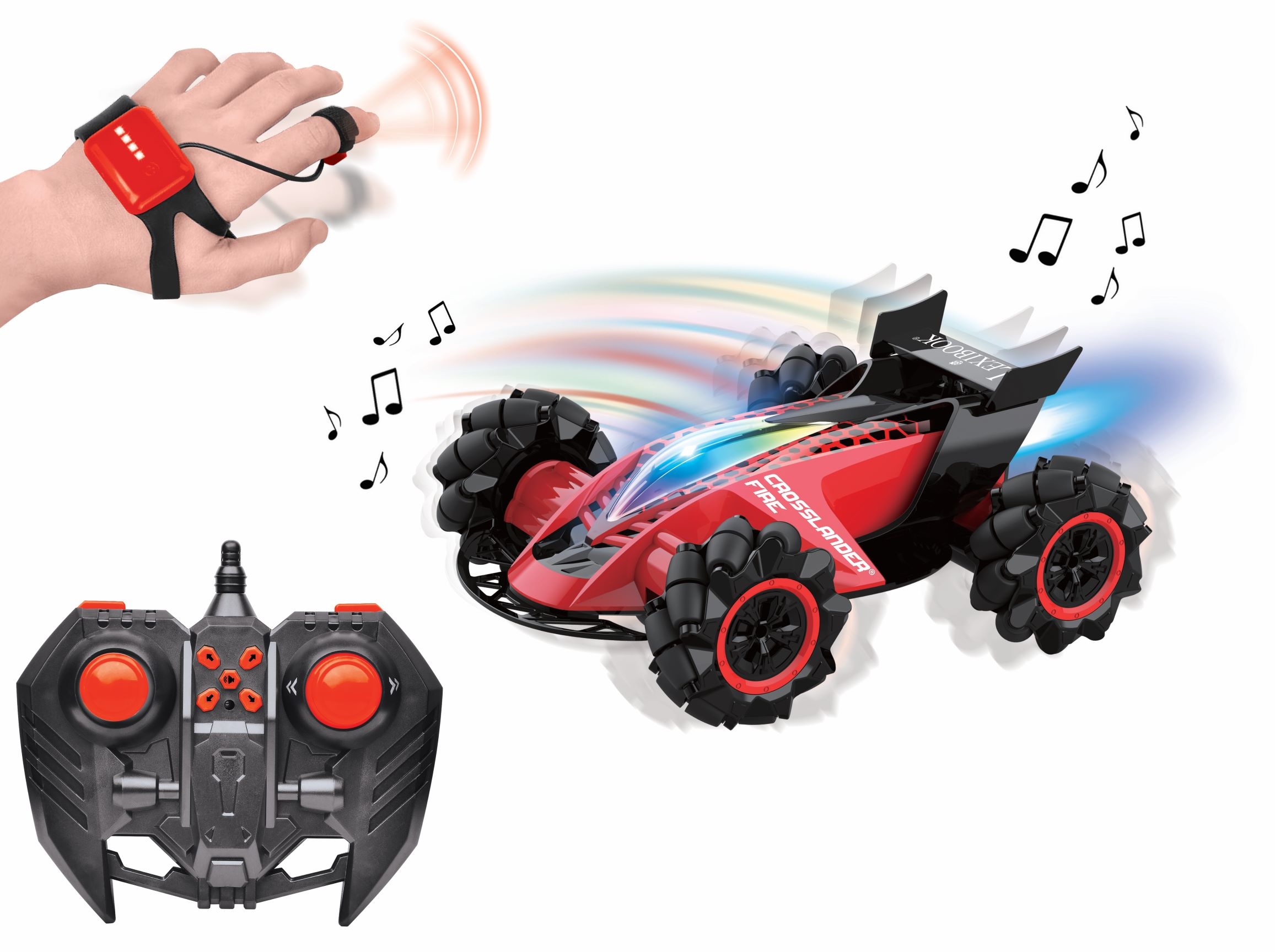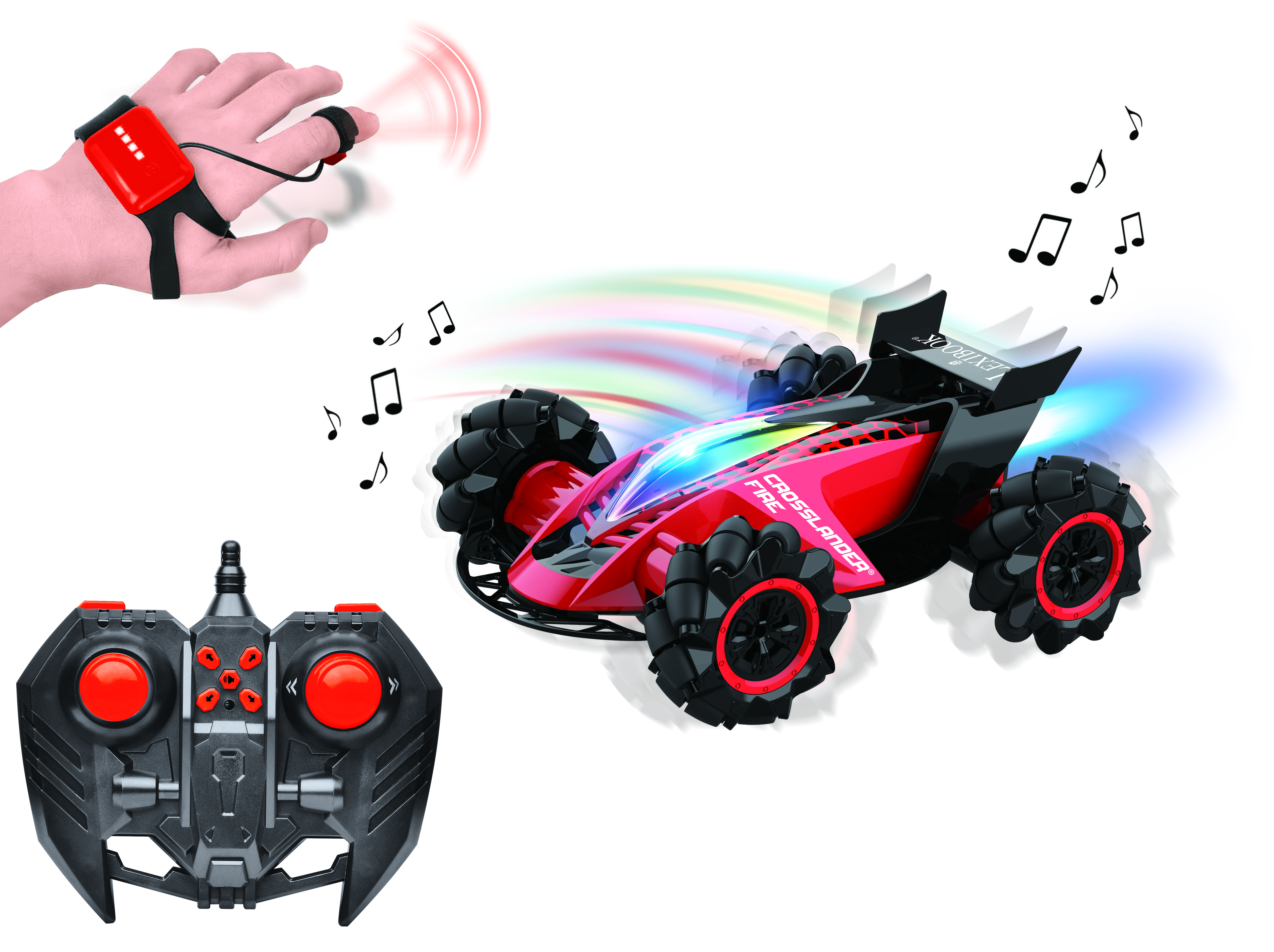 * Une voiture télécommandée avec contrôle gestuel ! * 2 modes de commande : avec la télécommande ou bien avec le bracelet de contrôle gestuel ! * Contrôle gestuel : la voiture avance, recule, ou se déplace sur les côtés grâce au capteur de mouvement intégré au bracelet. * Mode démo pour des cascades démentes avec frumée à l'arrière et musique : 3 chorégraphies incluses ! * Échelle 1/16. * Effets lumineux et sonores incroyables * Batteries rechargeables (pour la voiture et la commande poignet). * Temps de charge : environ 2,5-3 heures (voiture) et 1 heure (commande poignet). * Autonomie : 20 minutes (voiture) et 8 heures (commande poignet). * Fréquence : 2.4 Ghz. *Echelle: 1:16 * Portée : 15 mètres pour le contrôle gestuel et 25 mètres pour la télécommande. * Garantie : 2 ans - Conçu et développé en Europe - Fabriqué en Chine.