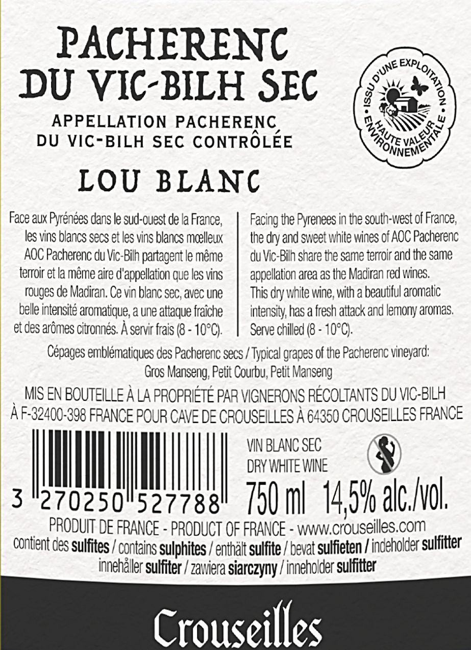 | Libellé | Crouseilles Lou Blanc, 2022 - Pacherenc du Vic-Bilh AOP - Blanc Sec - 75 cl |