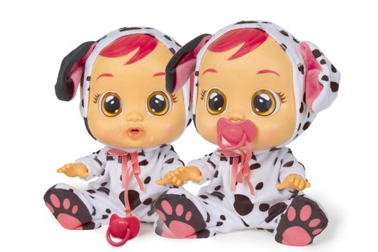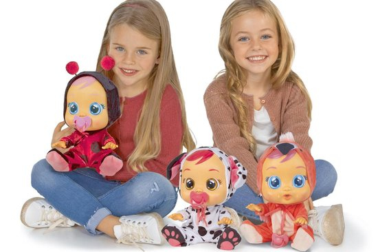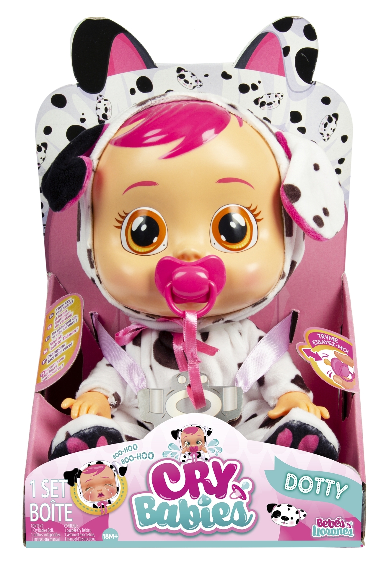 Les Cry Babies sont d'adorables bébés mais ils sont très capricieux ! Quand on leur retire la tétine, ils sanglotent et pleurent de vraies larmes ! Ton Cry Babies réclame ton attention: prends soin de lui, scalîne-le, sèche ses larmes et redonne-lui sa tétine pour qu'il arrête de pleurer. Chaque Cry Babies est unique, et est vêtu d'un pyjama au design différent. Leur pyjama tout doux est interchangeable et peut se laver à la machine. Inclus également une tétine. Piles incluses. Les Cry Babies existent en plusieurs modèles différents: Lady la coccinnelle, Fancy le flamant rose et Dotty le dalmatien.