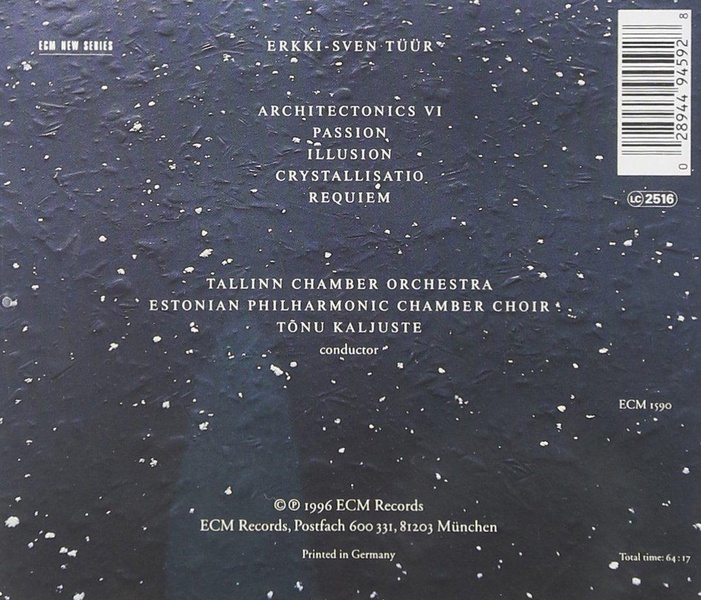 Liste des pistes 1.01 . architectonics 6, for flute, clarinet, vibraphone & strings - Erkki-Sven Tüür1.02 . passion, for strings - Erkki-Sven Tüür1.03 . illusion, for strings - Erkki-Sven Tüür1.04 . crystallisatio, for 3 flutes, campanelli, strings & live electronics - Erkki-Sven Tüür1.05 . requiem, for soprano, tenor, mixed choir, triangle, piano & strings - Erkki-Sven Tüür