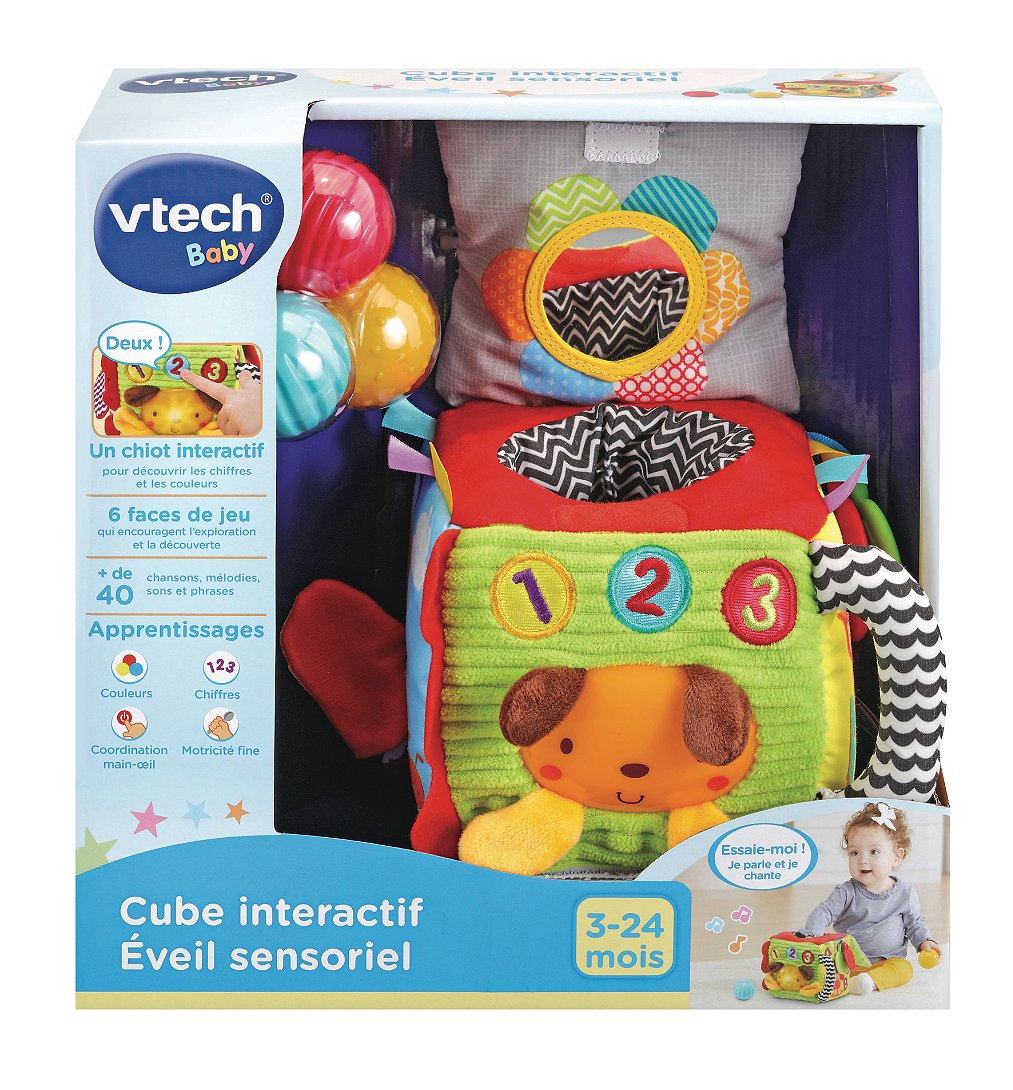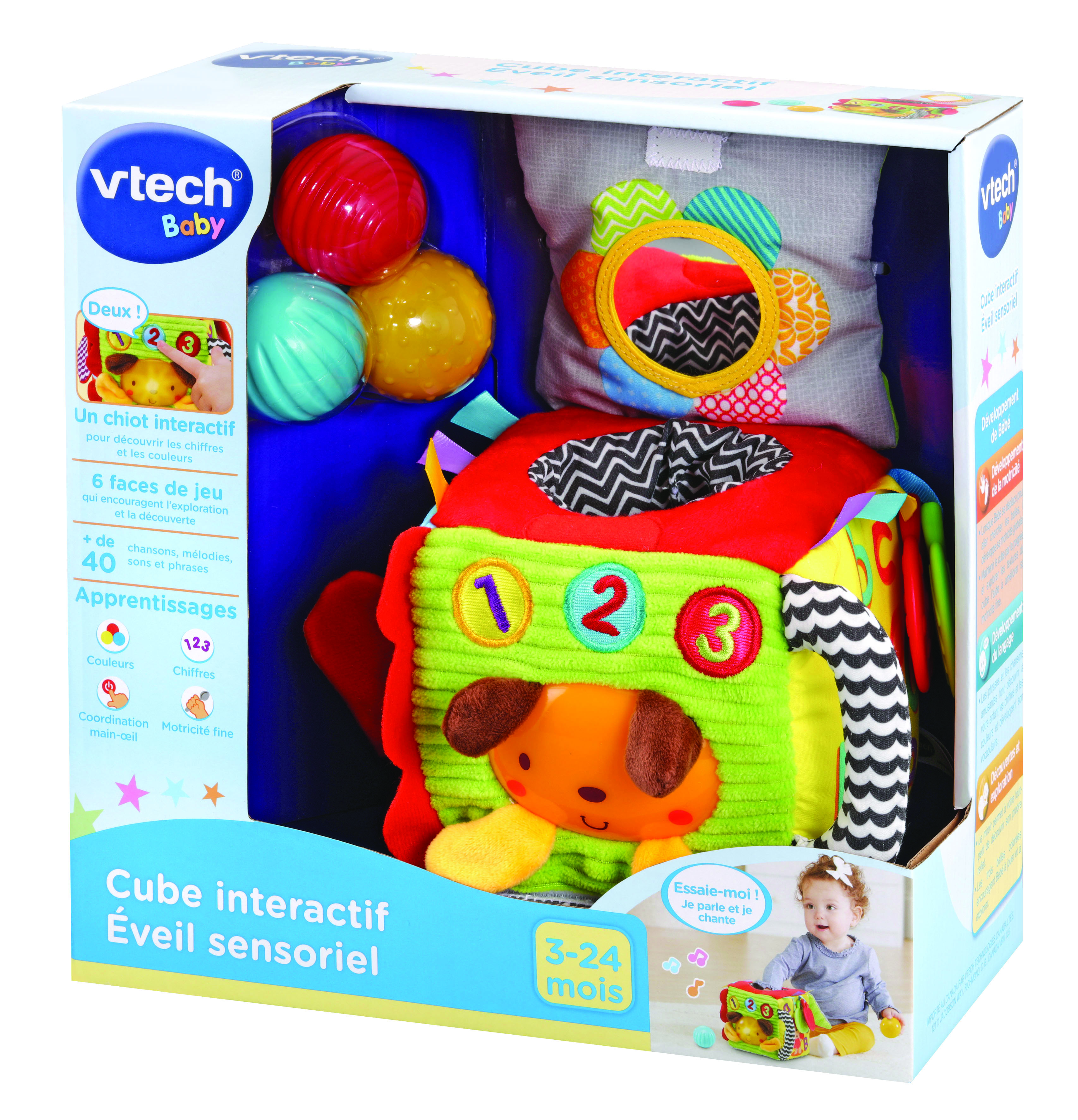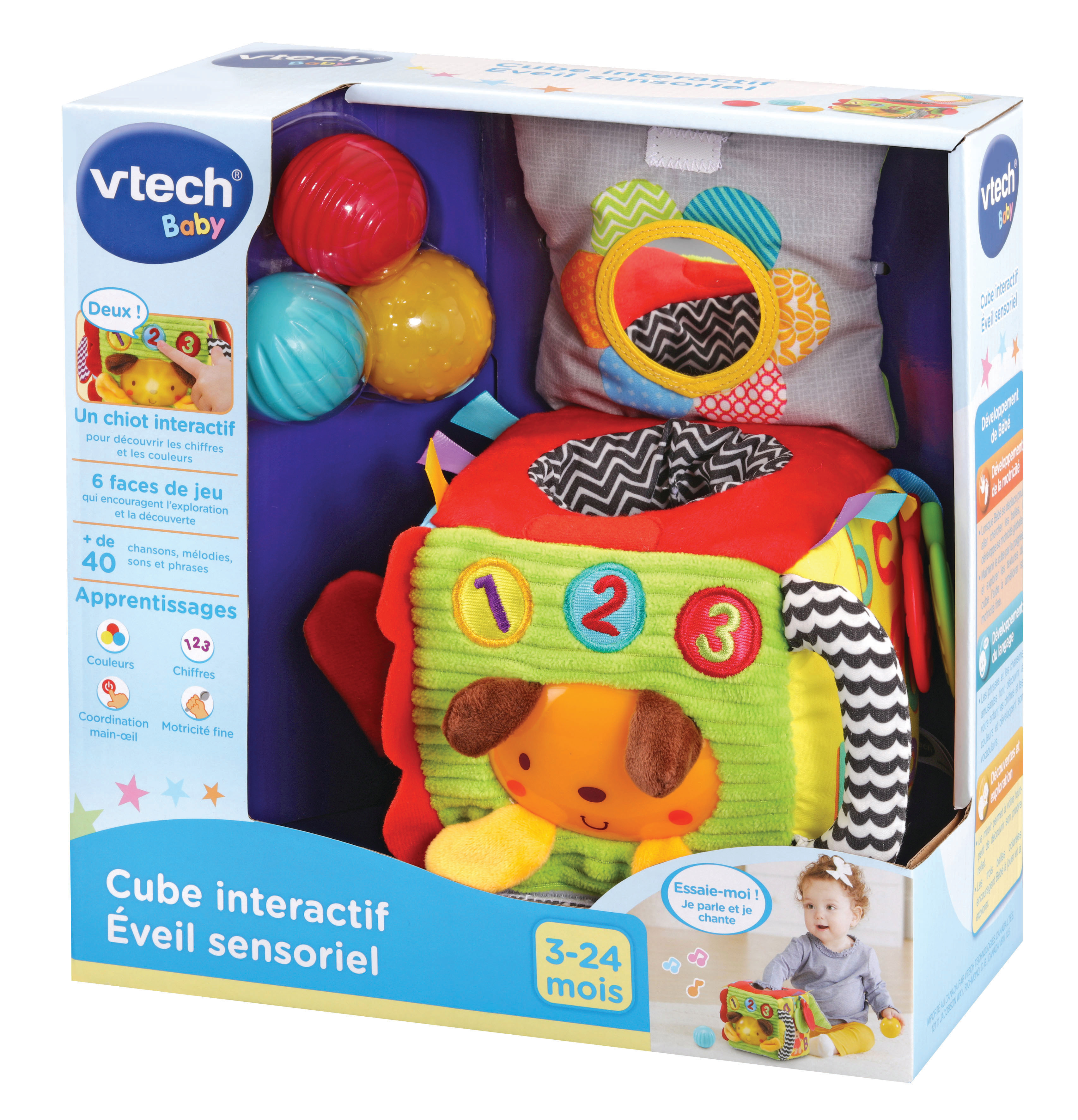 Cube interactif éveil sensoriel - 3 - 24 mois Bébé développe son sens du toucher en jouant avec les 6 faces du cube. 3 boutons pour découvrir les couleurs, les formes, les chiffres et bien plus encore Le visage de du chiot s’illumine au rythme des mélodies Différentes textures et des éléments à manipuler pour développer la motricité fine de Bébé : hochets pomme, miroir, poignée, etc. Trois balles de jeu aux différentes matières incluses + de 40 chansons, mélodies, sons et phrases Arrêt automatique Boîte Try-me. Fonctionne avec 2 piles LR03 incluses.