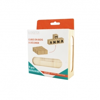 Cubes puzzle en bois à décorer 9 cubes 4 cm;Sodertex propose des cubes puzzle en bois à décorer, composés de 9 pièces de 4 cm. Ces supports en bois sont parfaits pour les loisirs créatifs, offrant à la fois solidité et aspect naturel....;Cubes puzzle en bois à décorer 9 cubes 4 cm;Sodertex propose des cubes puzzle en bois à décorer, composés de 9 pièces de 4 cm. Ces supports en bois sont parfaits pour les loisirs créatifs, offrant à la fois solidité et aspect naturel.;Les enfants pourront s'amuser à décorer des masques, des puzzles 3D ou même recréer le système solaire avec notre mobile en bois. Les adultes, quant à eux, pourraient essayer de créer un calendrier perpétuel.;Les cubes en bois sont prêts à être décorés et mesurent environ 4 cm x 4 cm x 4 cm. Ils sont idéaux pour la création d'objets de décoration, notamment par les enfants, qui pourront laisser libre cours à leur imagination et personnaliser les cubes avec de la peinture, créant ainsi un dessin à recomposer en puzzle.;Ces cubes en bois sont adaptés aux petites mains des enfants et favorisent leur motricité. De plus, ils sont résistants, solides et durables dans le temps.