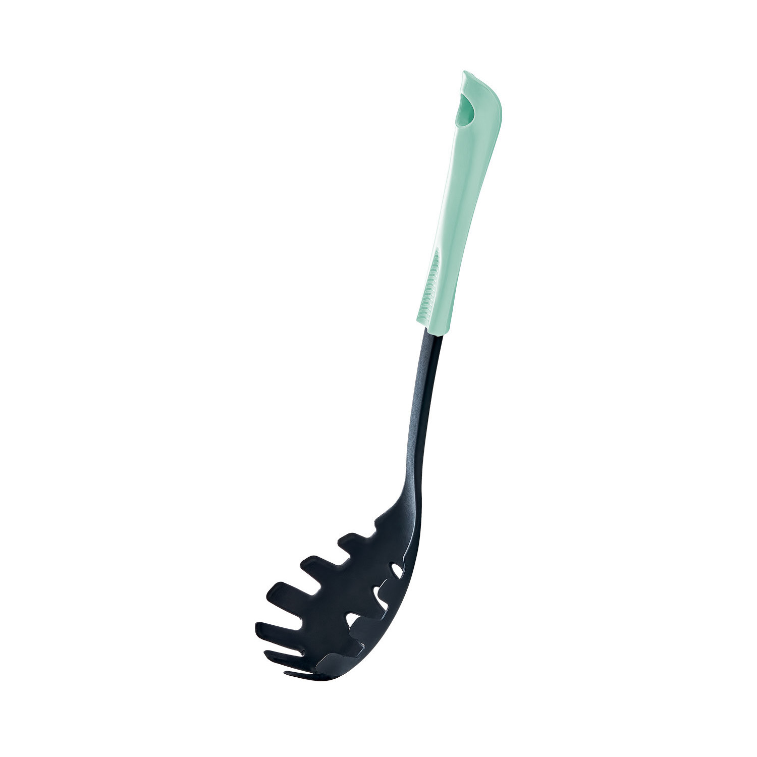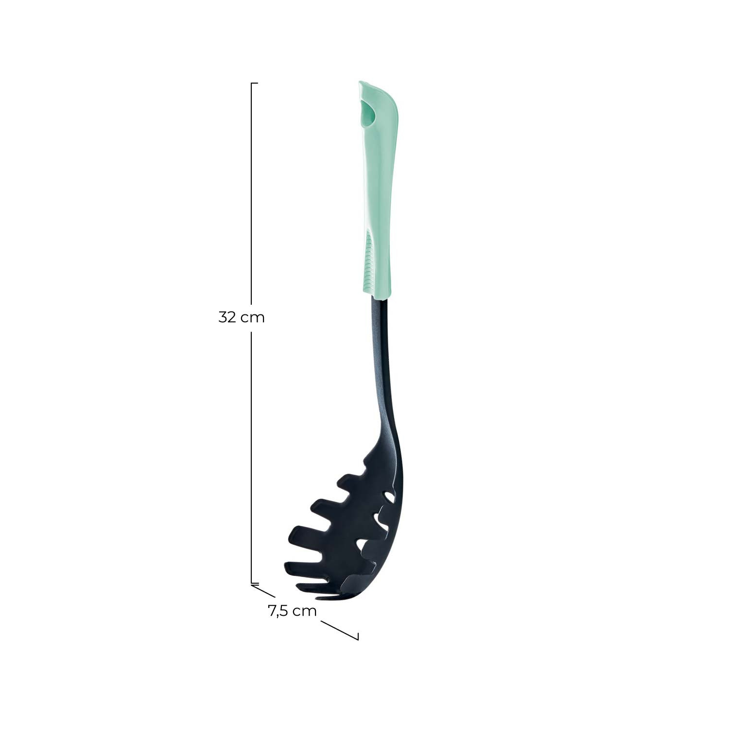 Fabriqué en plastique PP et nylon, durable et résistant pour un usage quotidien à la maison. Cuillère à spaghetti disponible dans une variété de couleurs : noir/rose, noir/vert et noir/gris dans une belle finition mate. Cet ustensile de cuisine a des dimensions de 32x7,5 cm (longueur x largeur).