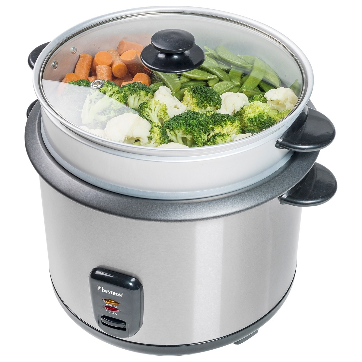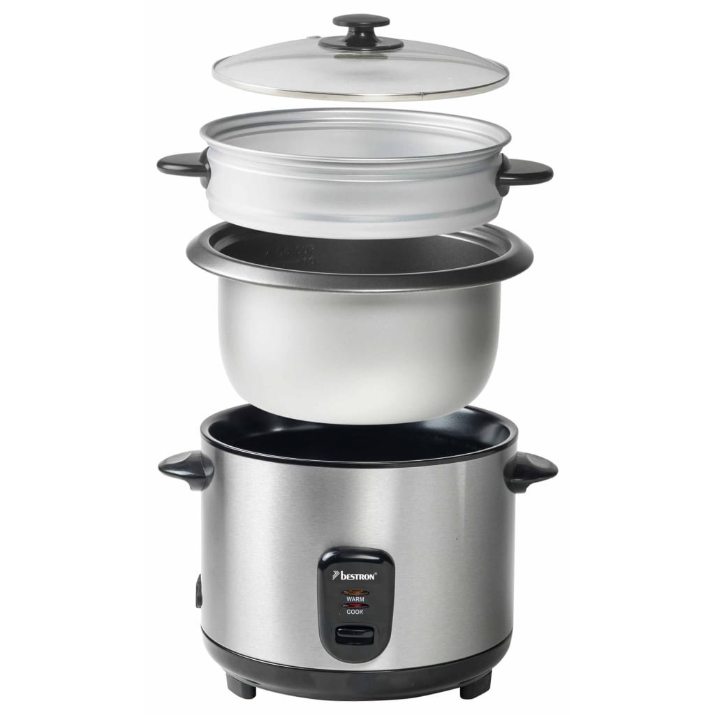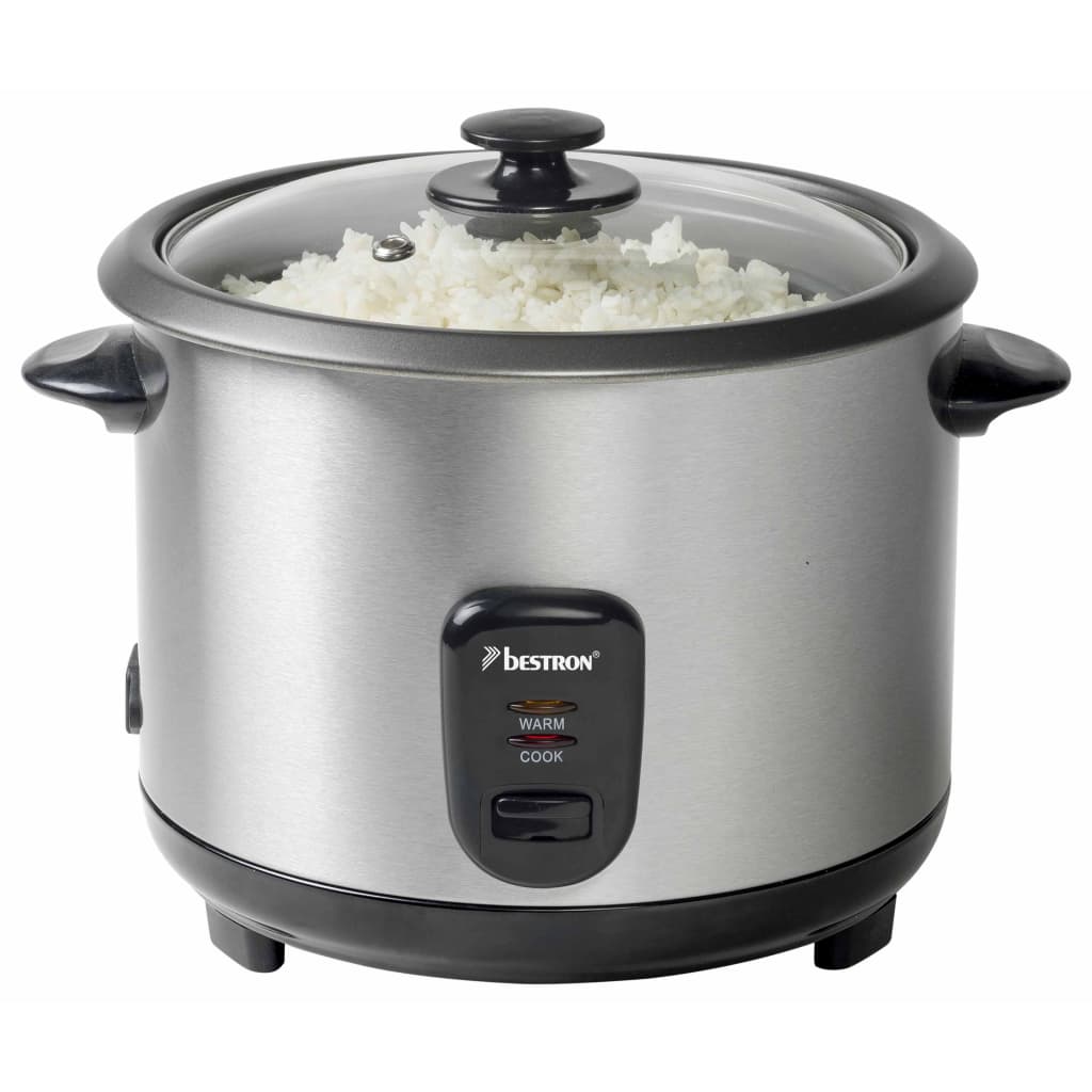Le cuiseur à riz ARC180 de la marque Bestron en acier inoxydable peut cuire un maximum de 1 350 grammes de riz, ce qui est parfaitement suffisant pour une famille de 8 à 10 personnes.