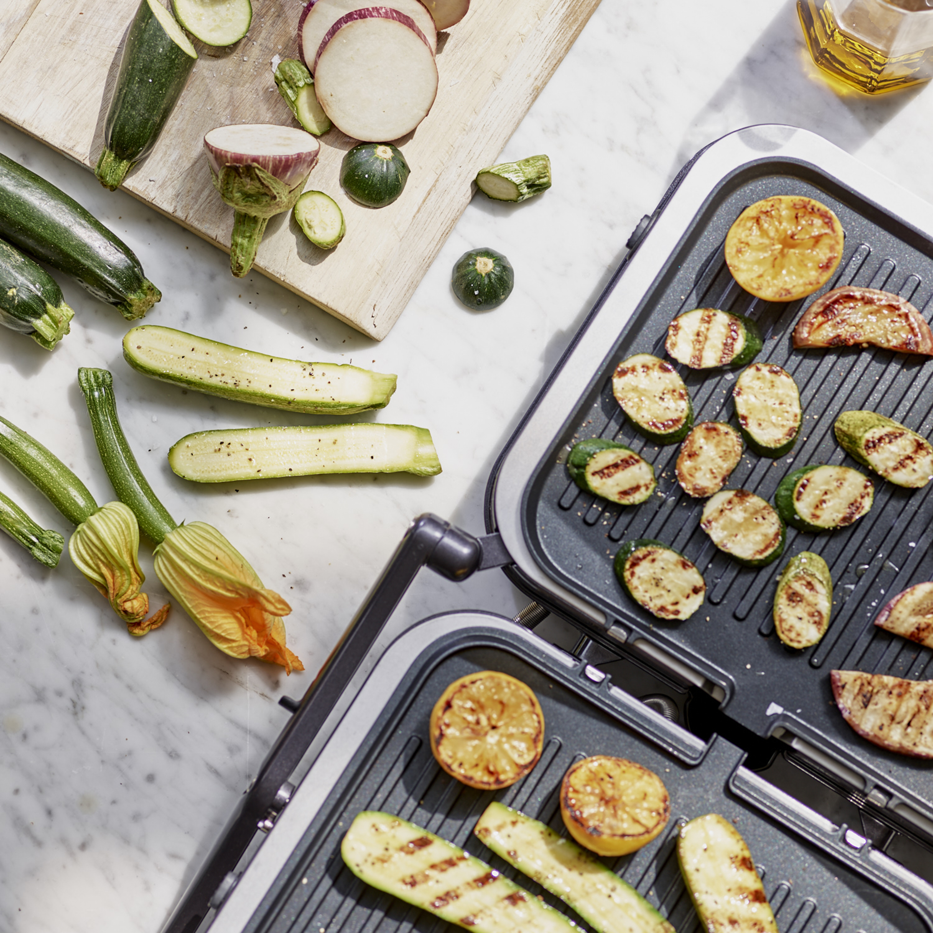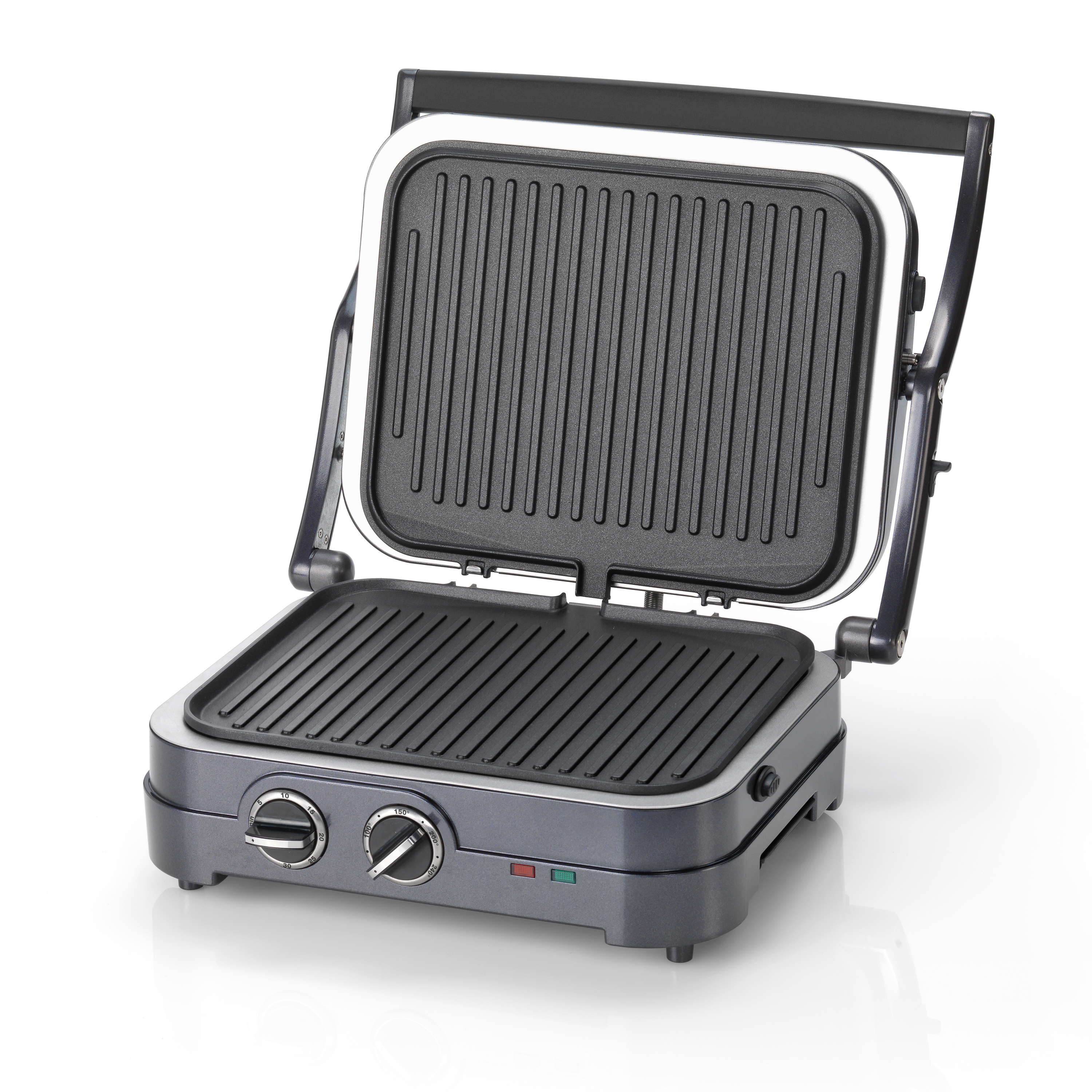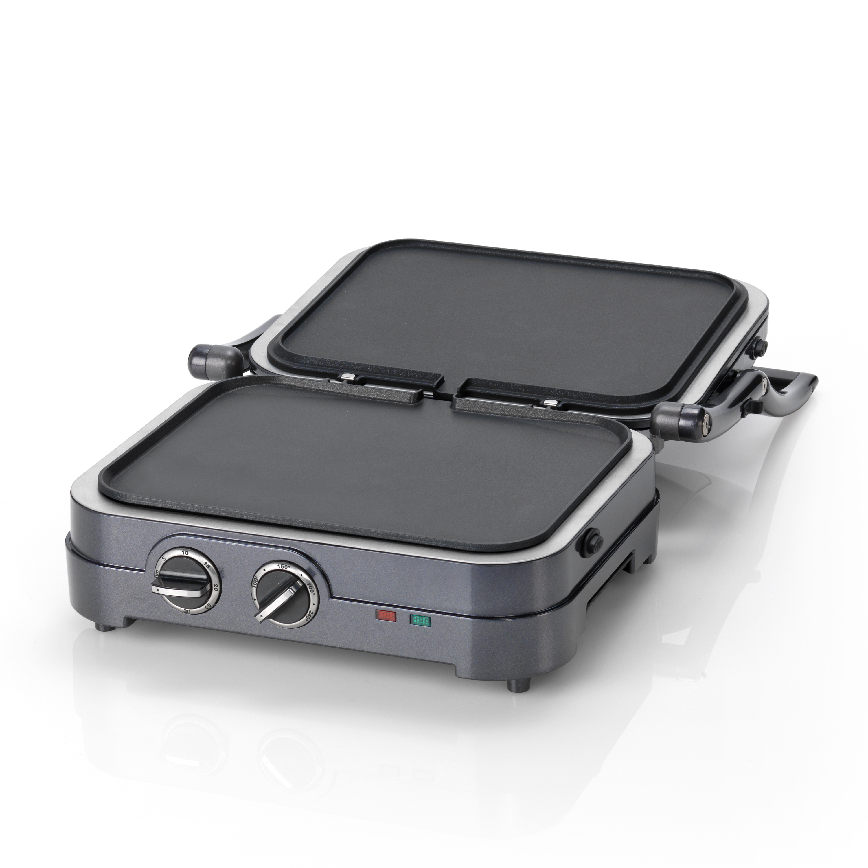 Lors d'une utilisation fermée, les charnières flottantes permettent à la partie supérieure d'appuyer délicatement sur l'ingrédient, sans l'écraser. En utilisation ouverte, pour des aliments plus fragiles, on dispose aussi d'une surface de cuisson doublée. Le minuteur permettra de maîtriser le temps de cuisson.