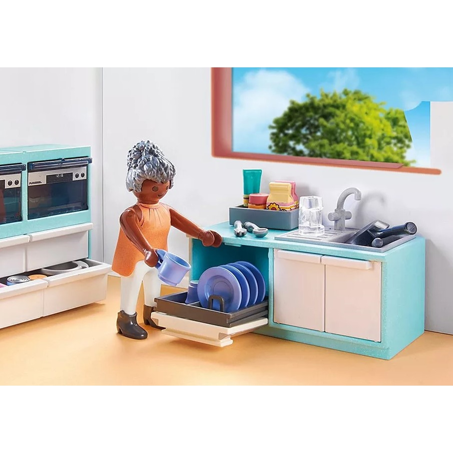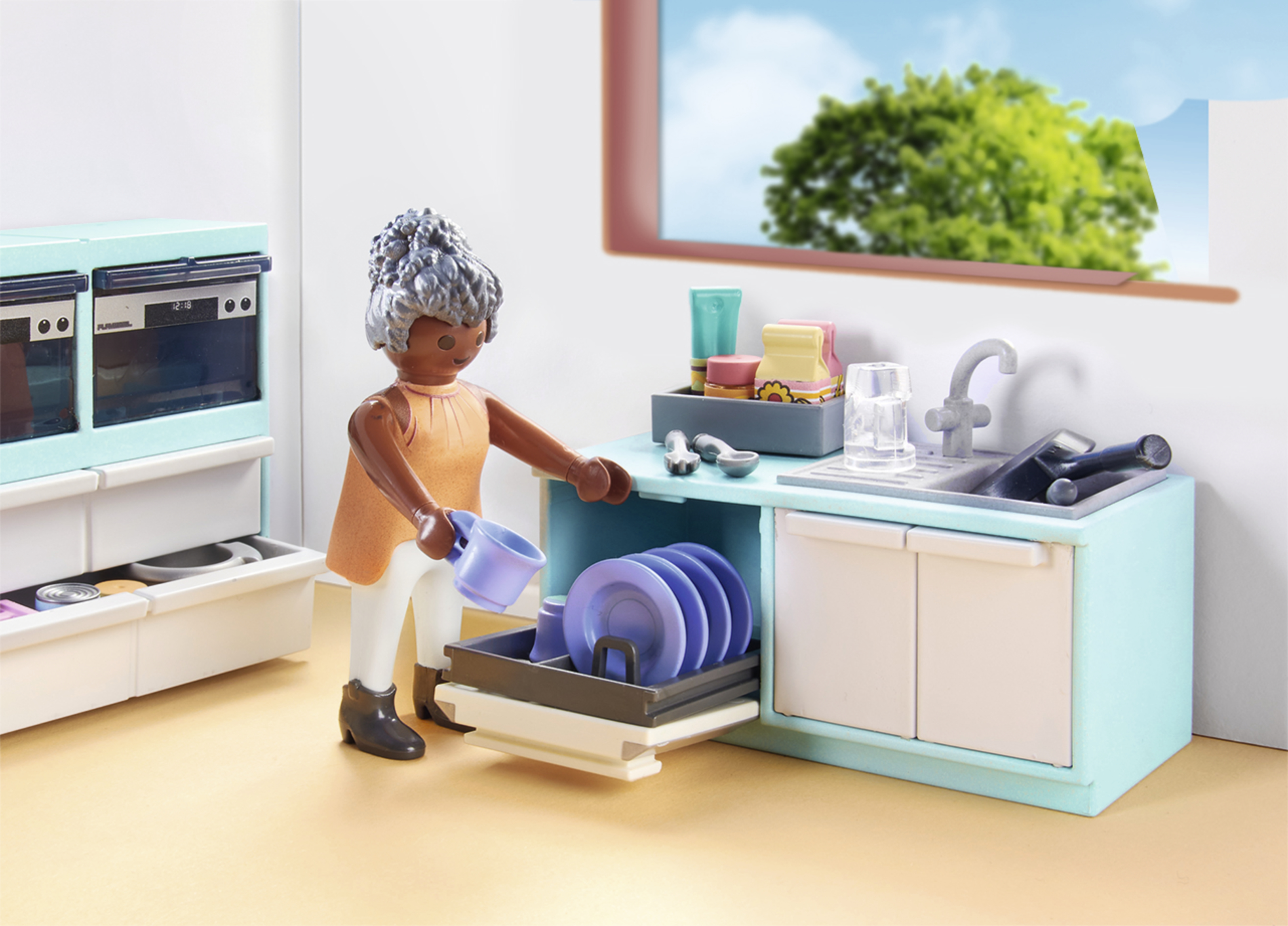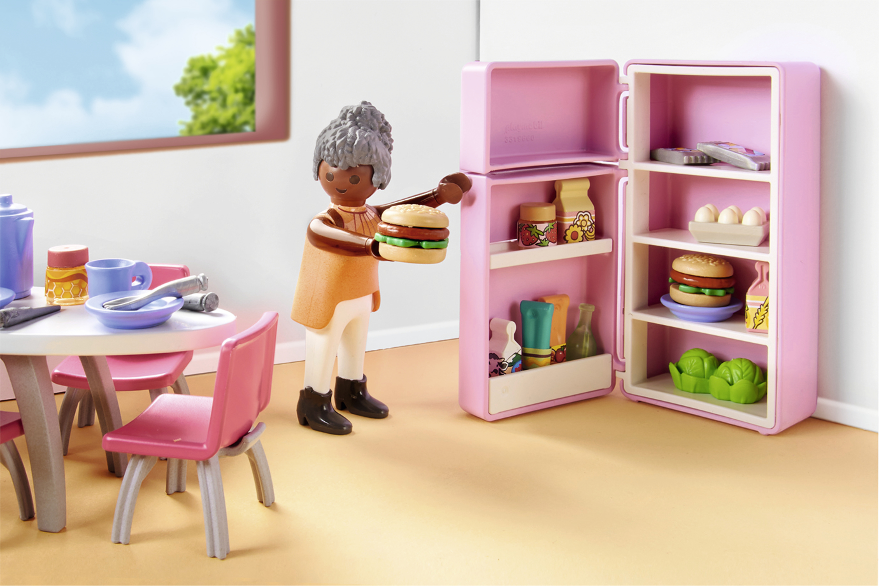 Tu viens visiter notre maison ? Comprend un personnage, une grande cuisine ouverte avec îlot de cuisine, un réfrigérateur, une table à manger et des équipements.