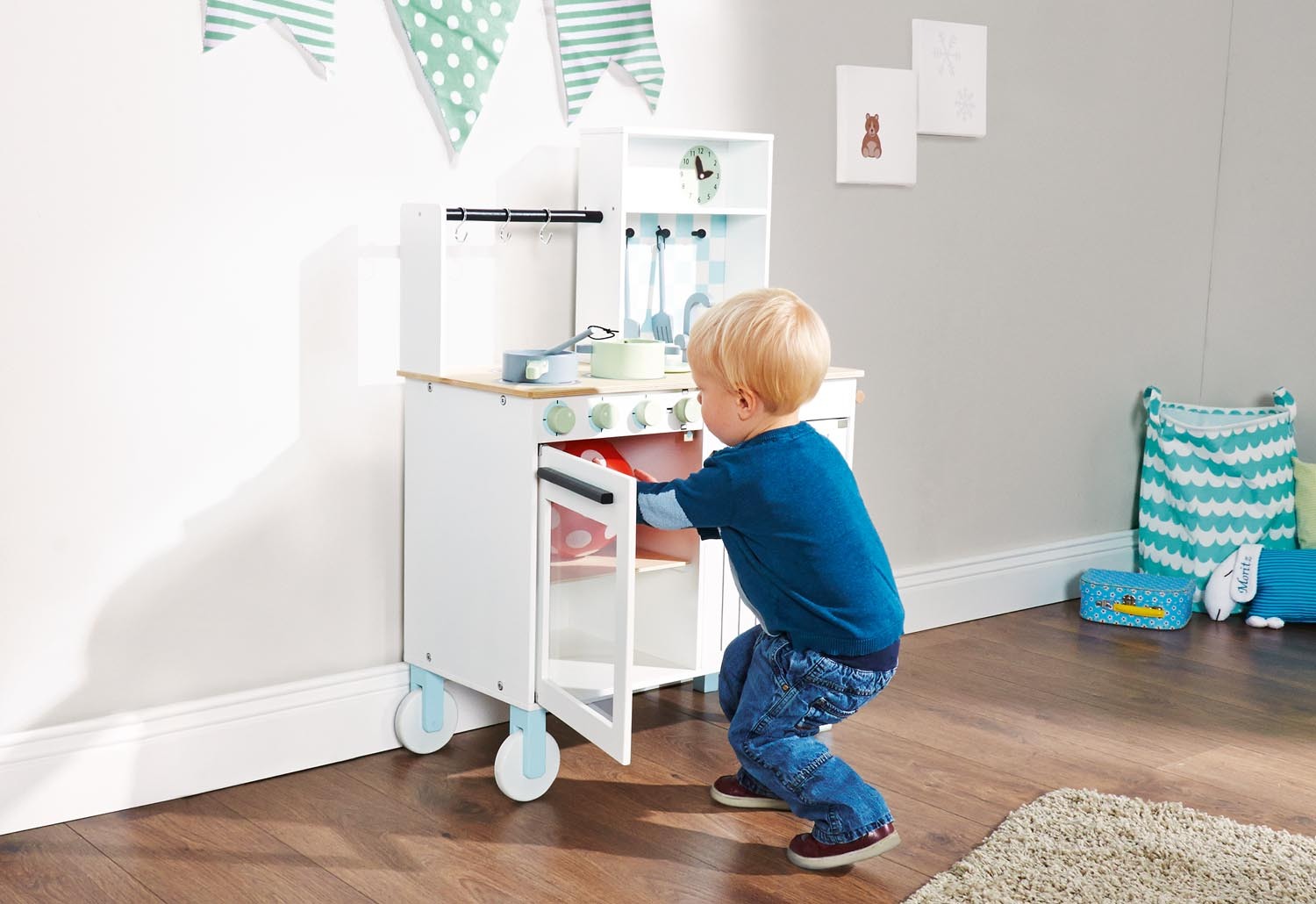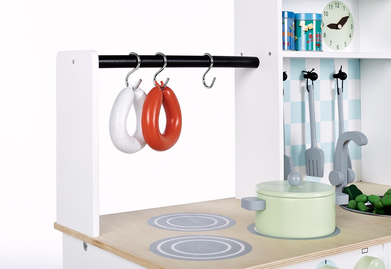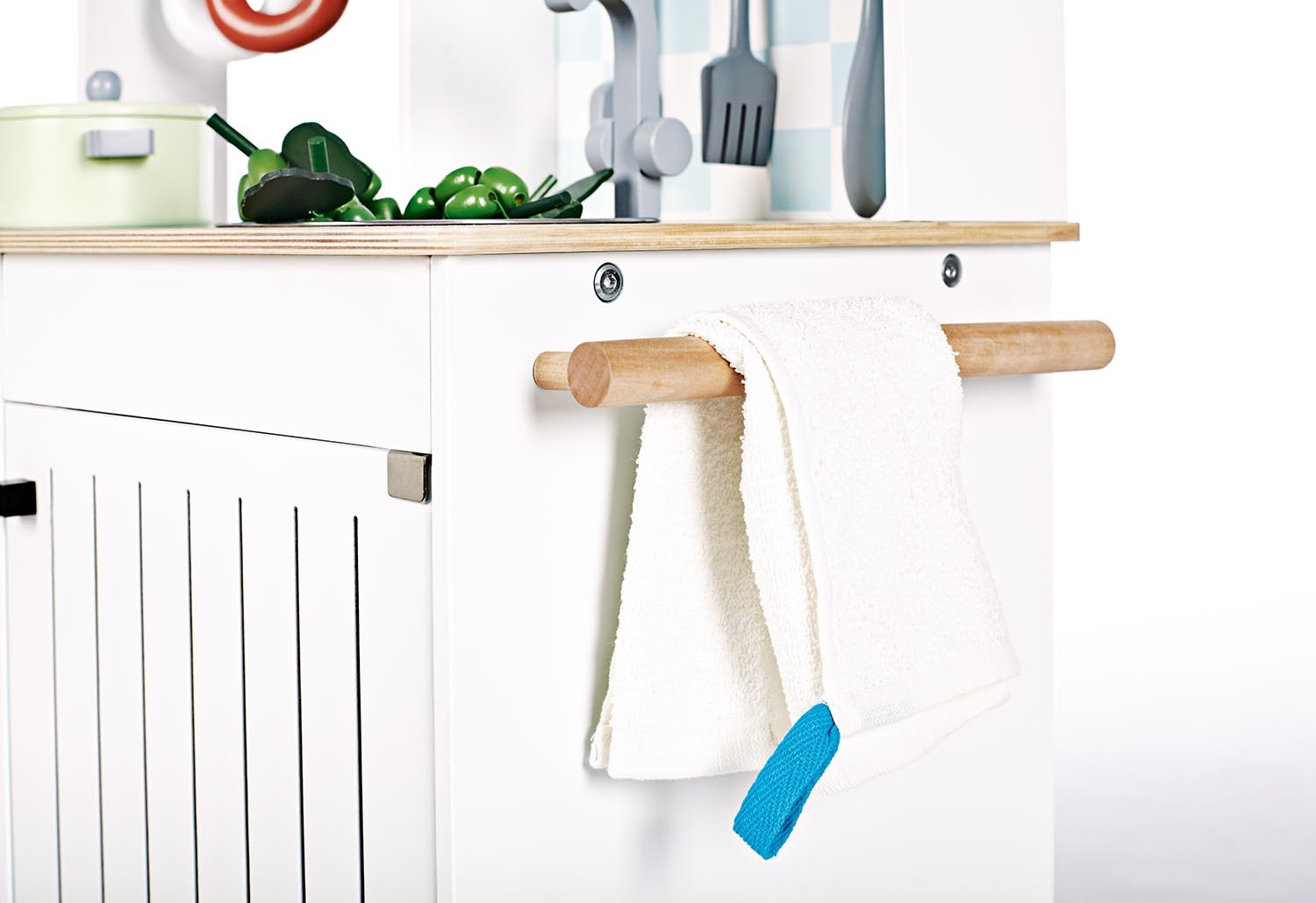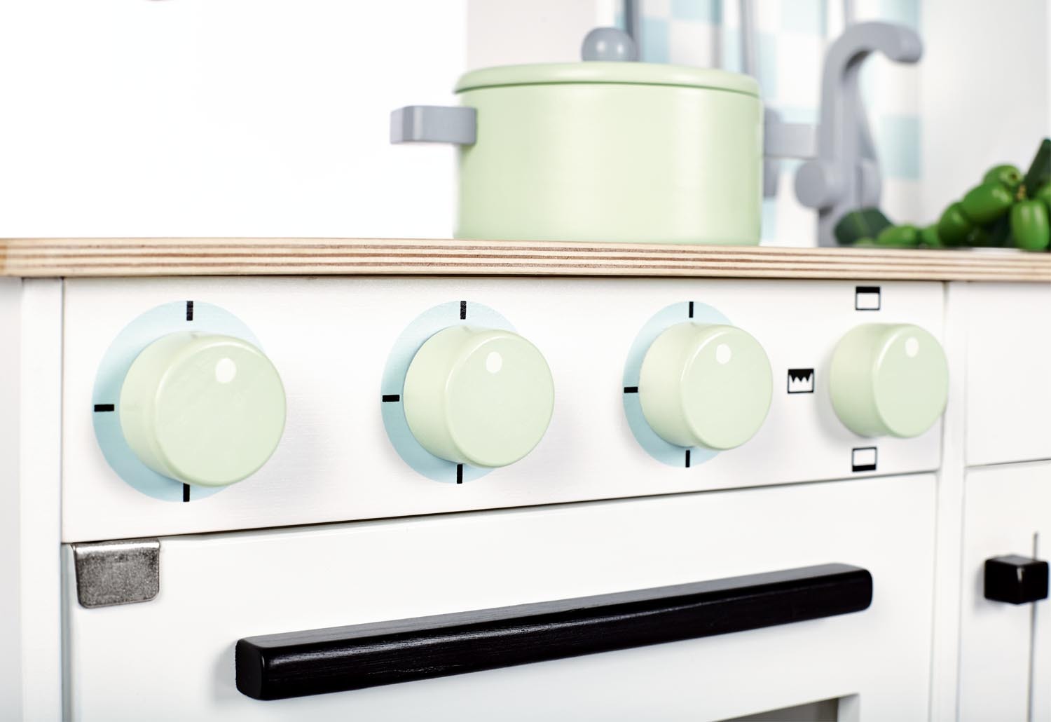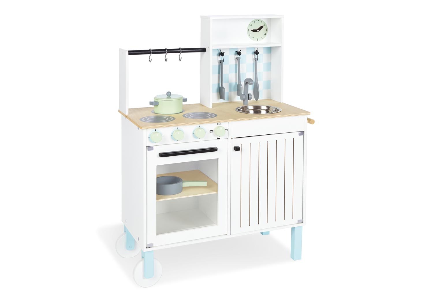 - Partiellement massif : tilleul et MDF, laqué multicolore - L 69 cm, P 33 cm, H 90 cm - Plan de travail H 56 cm - 2 portes - Evier en inox - Boutons rotatifs (avec bruit d’encliquement) - Avec ustensiles de cuisine (3 pièces) et 2 pots - Avec 2 roulettes