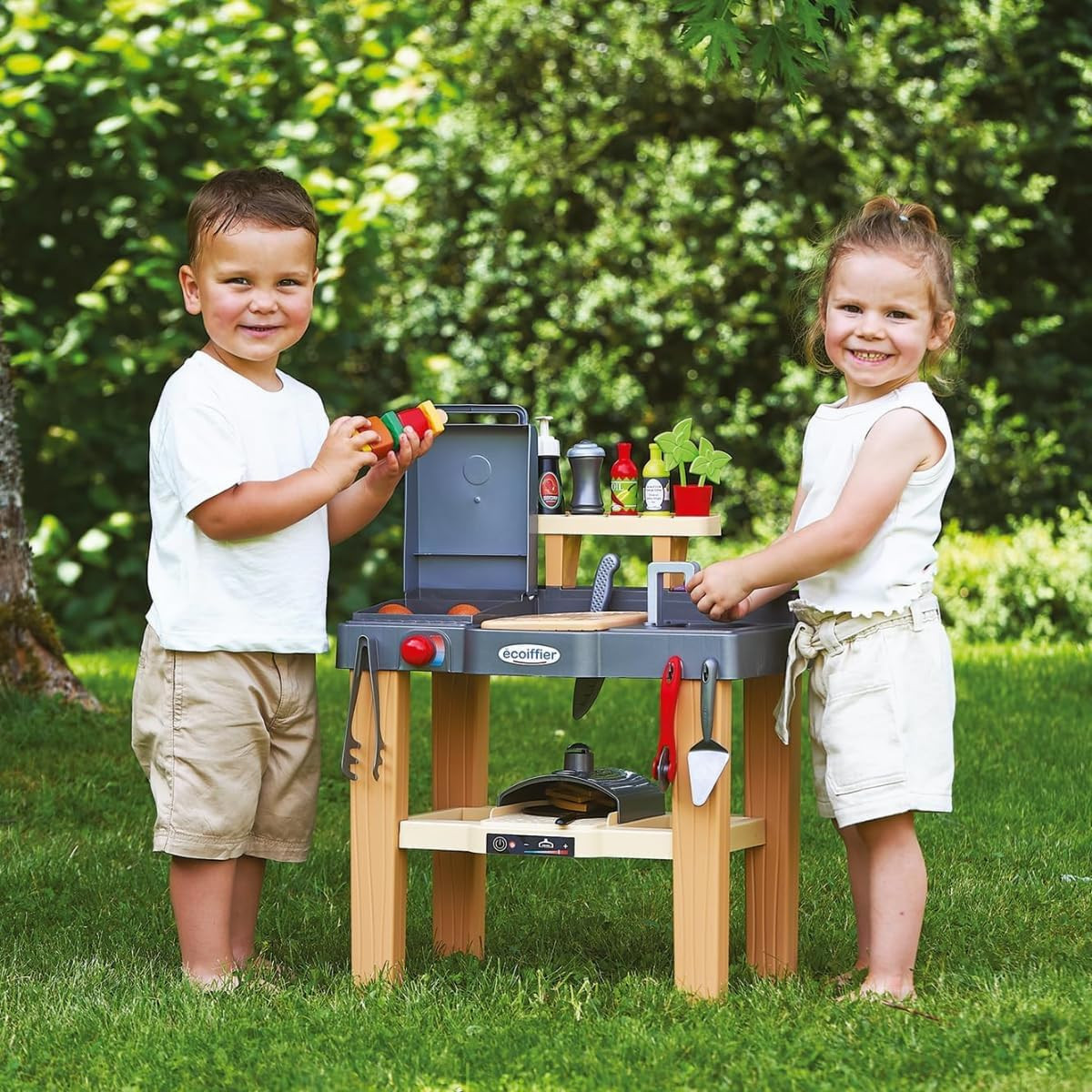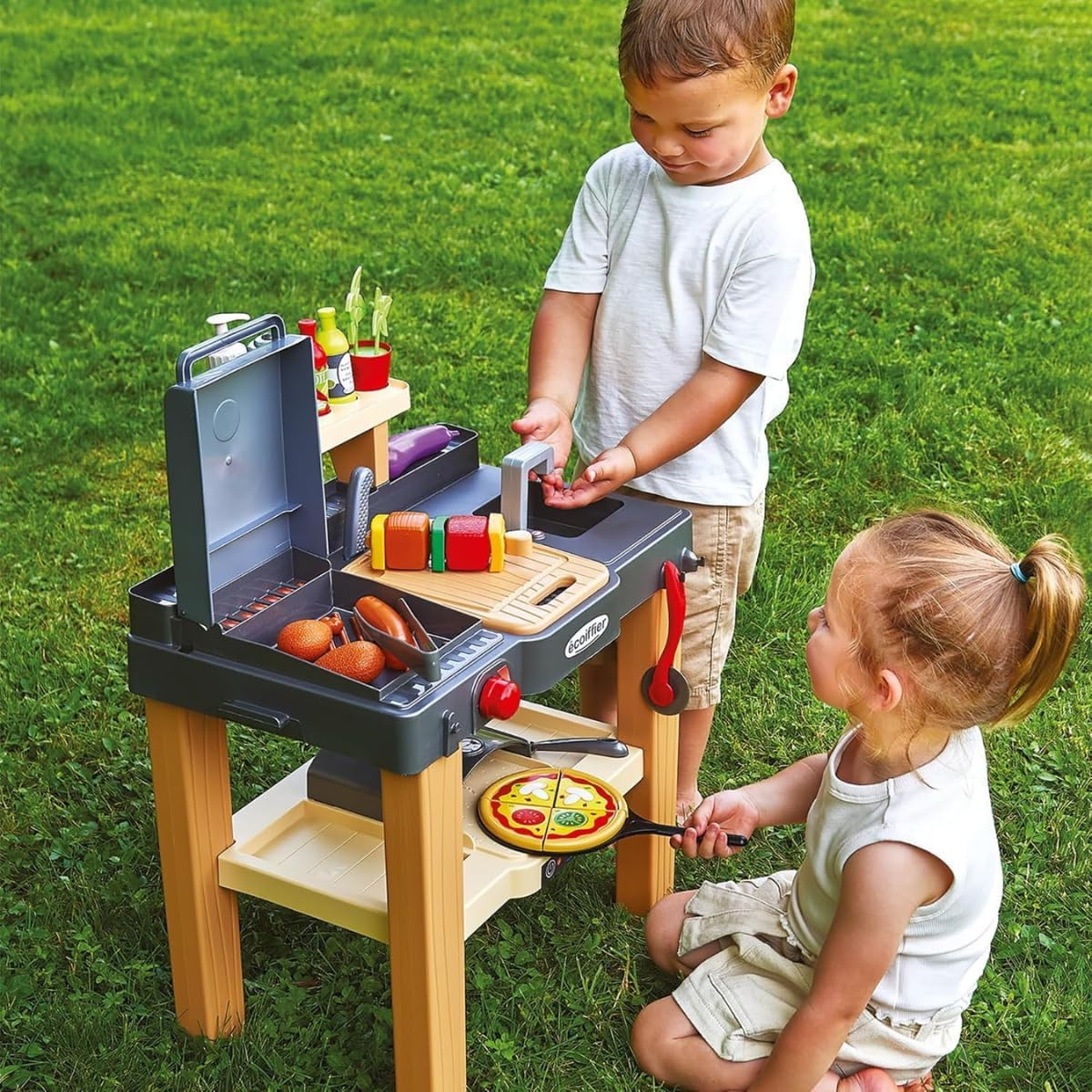 Cuisine d'été composée d'un four à pizza, d'une plancha, d'un espace de découpe, d'un évier et de nombreux accessoires et aliments pour cuisiner. Dès 18 mois. Origine France Garantie.