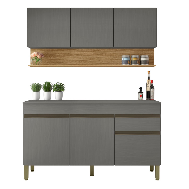 Cuisine Equipée Kitchenette 6 Portes et 1 Tiroir Imitation Chêne et Gris Structuré Largeur 150 cm